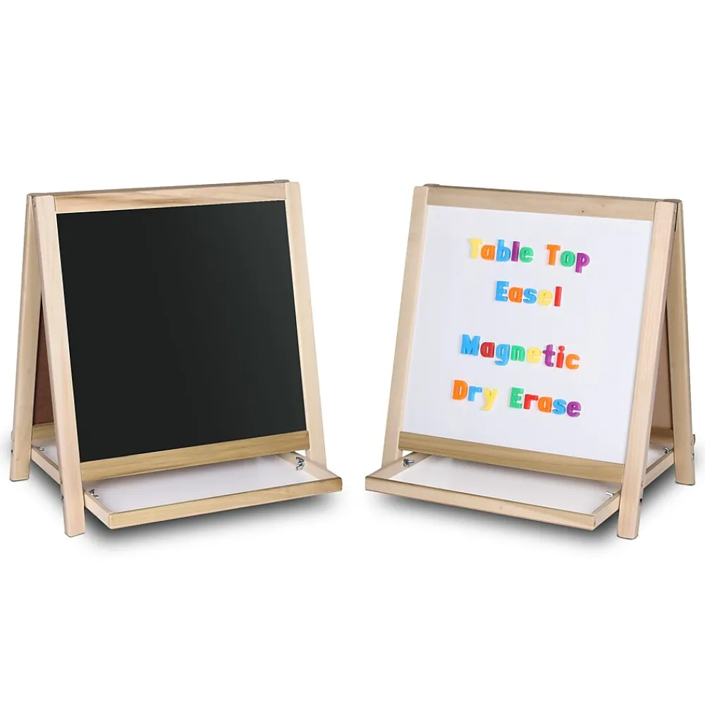 The Flipside framed wooden easel features a white magnetic dry-erase surface on one side and a black chalkboard on the reverse. The large center tray provides useful storage space. Perfect size for small group activities. For best results, prime the chalkboard surface by rubbing the entire surface with the side of a chalk stick, then erase completely.
