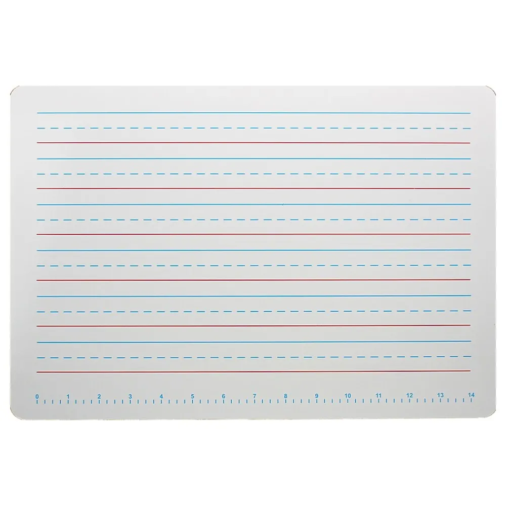 Primary Handwriting Board in Dry Erase for practice, practice, practice. 11″ x 16″ boards are ruled with 6 sets of 1″ lines featuring top lines and broken midlines in blue and baselines in red. Ruler along bottom edge measures items up to 14″. Bright white dry erase surface with hardboard backing and rounded corners for safety. Made in USA. Sold as a pack of 3 boards.