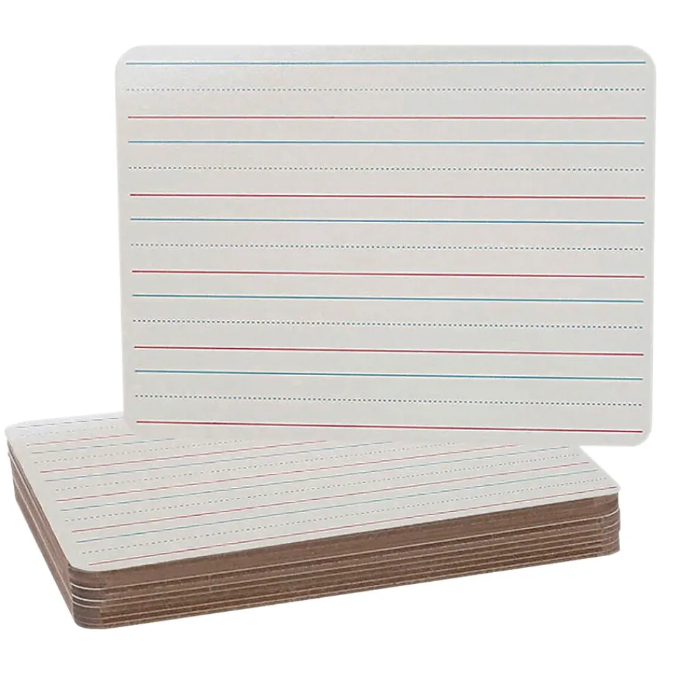 Board contains 5 sets of blue headline and broken midline plus red baseline format. Each line set measures 1-1/8″ with 3/8″ of blank descender space between sets. Back side is plain white dry erase. Board features a high-quality, non-ghosting write-and-wipe surface. Rounded corners and smooth edges for safety and comfort. Hardboard backing will not warp or chip. Board measures 12″ x 9″ x 0.125″ thick. Set of 12.