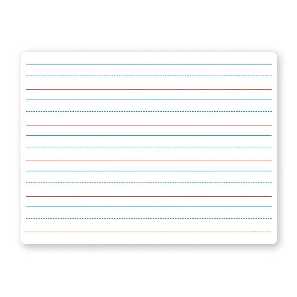 The two-sided red and blue ruled dry-erase board is great for teaching and practicing fundamentals at the early learning stage. This bright whiteboard contains five sets of blue headline and broken mid-line plus red baseline format. Each line set measures 1.13″ with 0.38″ of blank descender space between sets. Back side is plain white dry-erase. The board features a high-quality, non-ghosting write-and-wipe surface with smooth, rounded edges and corners. Hardboard backing will not warp or chip.