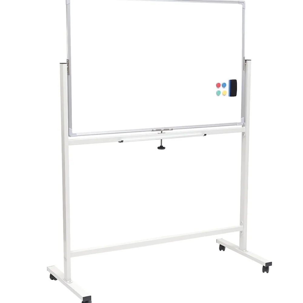 Our 48″ x 32″ Reversible Rolling Magnetic Chalkboard and Whiteboard features a 48″ x 32″ writing space, offering a flexible and versatile writing surface for various uses like teaching, planning, or presentations. Built with a robust yet lightweight steel frame, a 20-inch wide wheelbase, and four locking casters, this board ensures effortless mobility and secure positioning during use.