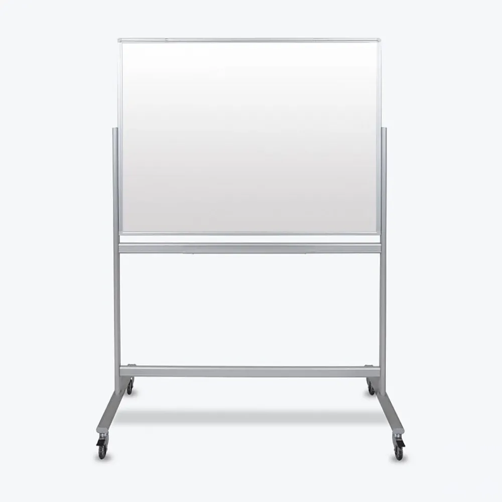 Luxor mobile magnetic glass whiteboards double the writing space and are designed to move easily from location to location making them perfect for collaborative workspaces. The durable aluminum frame and wide base create stability while the super-clear glass offers a bright white surface that is optimal for wet/dry erase markers. This double-sided magnetic glass board presents a contemporary look that complements any office, conference room, training center or classroom, while the 3″ rollerblade-style casters with non-marking treads guarantee smooth mobility. Luxor magnetic glass dry-erase boards are easy to assemble and are packaged with supportive materials that are highly resistant to damage during shipping.