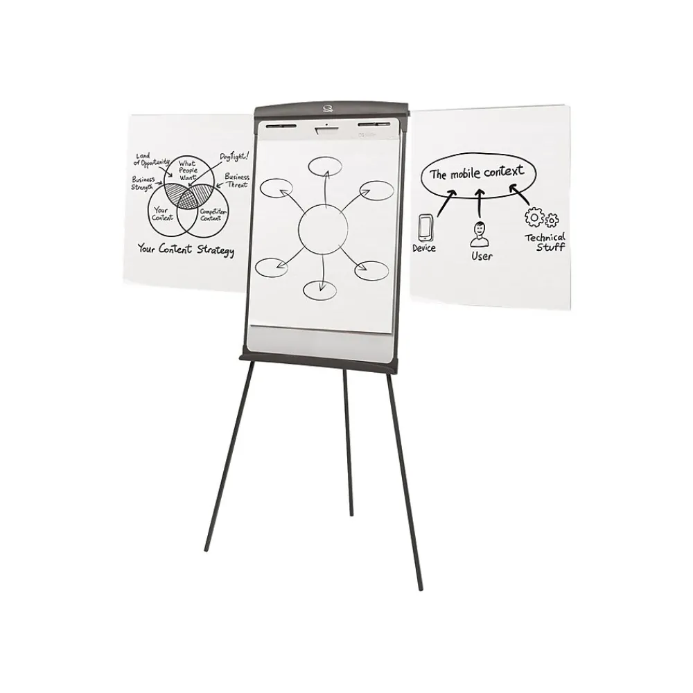 Use prepared diagrams and write impromptu notes on this 70-inch presentation easel, which features a magnetic, 27 x 35-inch whiteboard surface. This whiteboard easel includes one clamp and two arms that fold out to support flip charts on either side of the main display. The sturdy tripod legs telescope down, making this Quartet presentation easel easy to store and move between meetings or training sessions.
