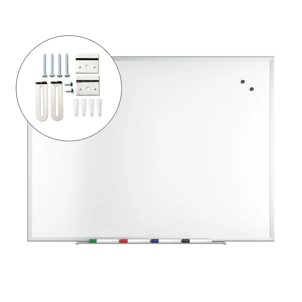 - Includes whiteboard, mounting kit, accessory tray, and 4/pack of TRU RED™ assorted chisel tip dry erase markers