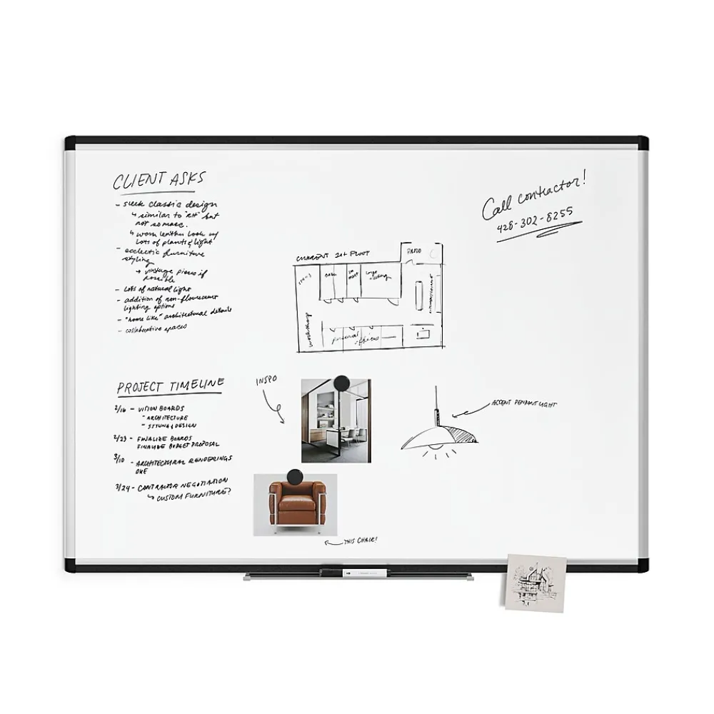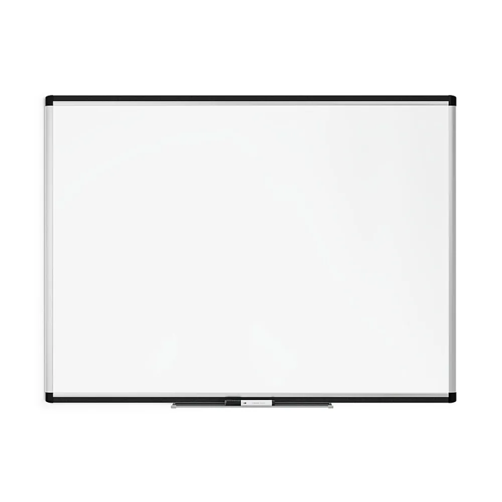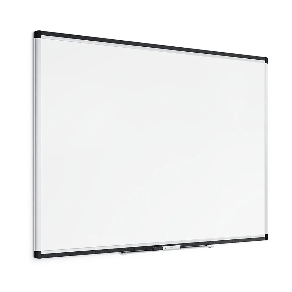 This U Brands PINIT whiteboard features painted magnetic steel dry-erase surface with built-in cork strip frame.