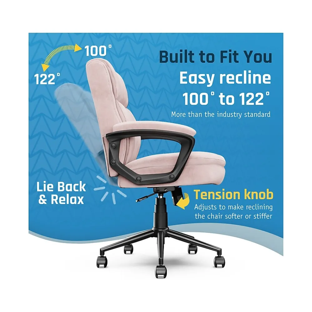 Bring relaxation to your busy workday with the Click365 Transform 2.0 ergonomic mid-back desk chair, which delivers American comfort with ultra plush padding in the headrest, backrest, and seat cushion. This chair has a 5″ thick contoured seat cushion and reliable ergonomic support, providing long-lasting comfort, and is perfect for everyday use at home and in the office. Pneumatic adjustable height, swivel base design, and quality smooth-rolling casters ensure this office chair is easy to move and position. The chair is upholstered in premium durable fabric over high-density foam and boasts a heavy-duty metal base and sophisticated stitching. You can purchase this chair with confidence.