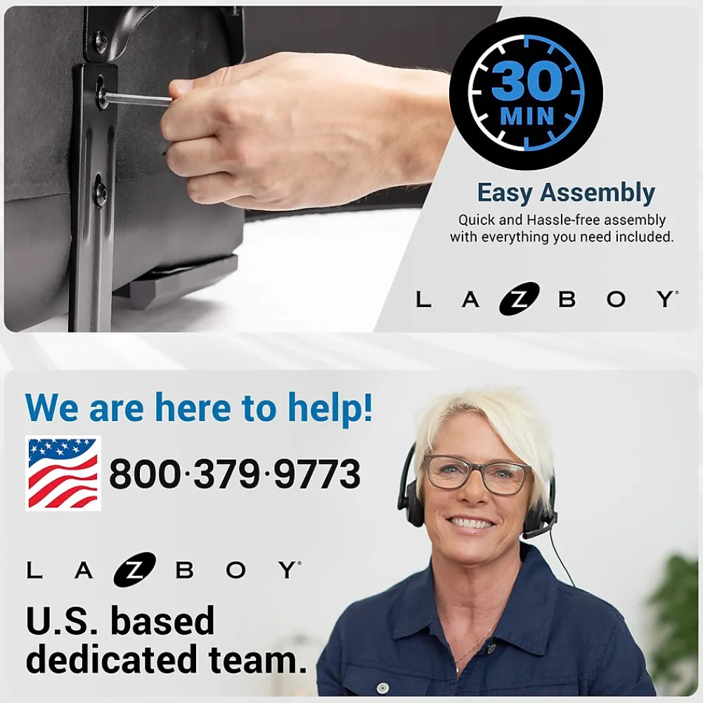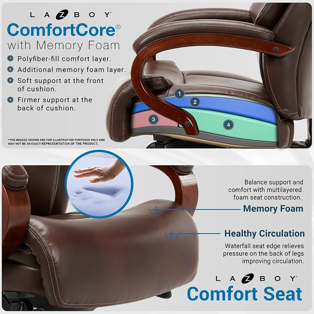Give your workspace an air of sophistication with this La-Z-Boy Bradley executive chair. The soft bonded leather upholstery offers a rich, inviting texture, while the warm color scheme delivers classic style. The elevated headrest, built-in lumbar support and curved waterfall seat provide all-day comfort. This desk chair features simple controls, so you can adjust the seat height and tilt tension to meet your personal preferences. A sturdy five-star base and rolling casters make it easy to move this chair from your desk to a nearby filing cabinet, credenza or printer stand. Complete with rich wood-finish accents, this La-Z-Boy Bradley executive chair brings CEO-worthy good looks to your corner office.