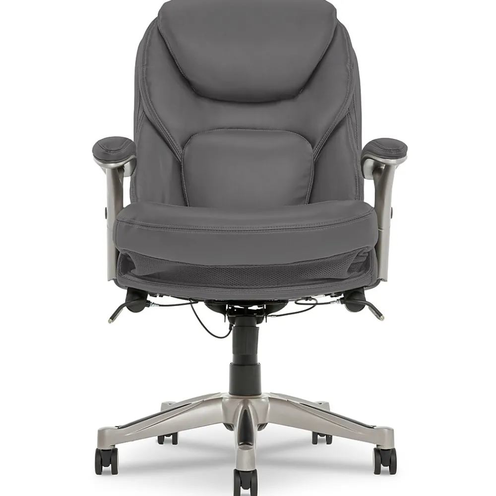 Help promote strength and flexibility in your back while you work with the Serta Back in Motion Executive Office Chair. This ergonomic office chair helps users become more productive and efficient by maximizing lower back support and comfort while seated. Its unique Back in Motion Active Seat Technology swivels the lumbar forward, providing the same effects as a pelvic tilt exercise by promoting spinal movement and flexibility in your core. Push-button adjustable armrests and pneumatic height adjustment allow the leather office chair to be quickly and easily customized to find the right fit for you. The multilayered cushions are soft yet supportive, so you’ll feel refreshed even after a long day.