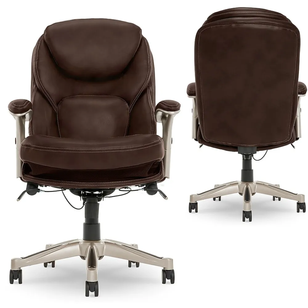 Imagine an office chair that helps promote strength and flexibility in your back. That’s the Serta Works ergonomic executive office chair with Back in Motion technology. This feature-rich, performance-focused chair helps its users become more productive and efficient by maximizing lower back support and comfort while seated. The Back in Motion active seat technology swivels the lumbar forward like the pelvis tilt exercise, promoting strength and flexibility in your core. The push-button adjustable armrests and pneumatic height adjustment can be customized to find the right fit for you. And the multilayered cushions are comfortable yet supportive, so you’ll feel refreshed and rejuvenated, even after a long day.