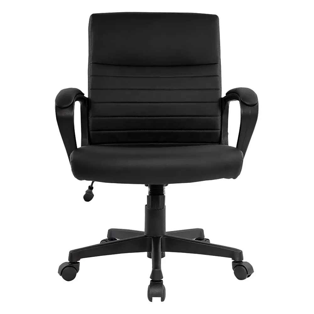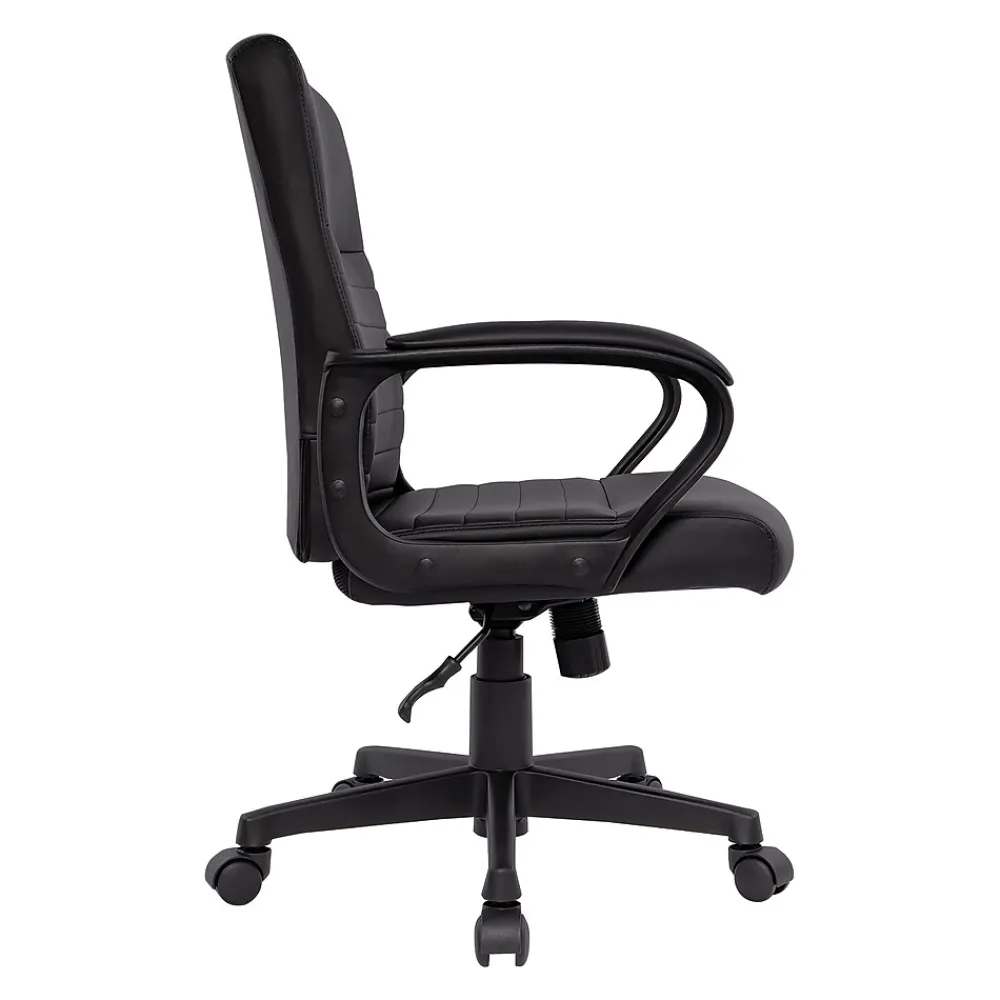 Stay comfortable while you work in this Tervina™ black managers chair. Padded armrests provide added comfort, and built-in lumbar offers additional support. The soft upholstery looks and feels just like real leather for an elegant finishing touch. Use the pneumatic seat height adjustment and tilt tension to find then lock the perfect setup for your body.
