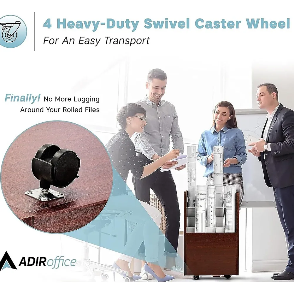 No matter how elaborate your current work-in-process is, there’s an efficient storage solution for keeping it organized. The AdirOffice Mobile Wood Blueprint Roll File holds your rolled blueprints, plan drawings, maps and other large-format documents snugly in square compartments, making it the perfect organizational solution. Sturdy and visually appealing, the unit is expertly crafted using durable wood composite to provide long-lasting strength and use for many years to come. Its furnished in your mahogany vinyl laminate that will seamlessly complement any existing decor and boasts a 50-pound weight capacity to hold all of your rolled files in one convenient place. The bottom of the cabinet is outfitted with four, swiveling casters to facilitate easy movement of your documents, while side handles make it easy to hold and transport the unit from one location to the next.