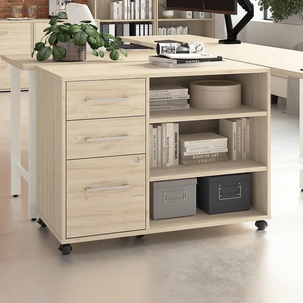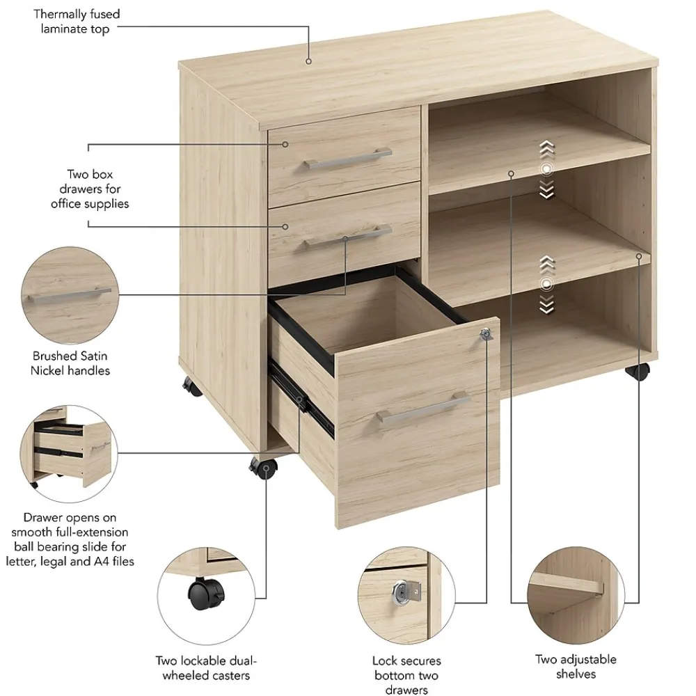 The Bush Business Furniture Hustle Office Storage Cabinet with Wheels provides the form and function needed to support your entrepreneurial spirit without breaking the bank. An ideal choice for small to medium-size businesses and home offices alike, the small cabinet rolls throughout your workspace to provide storage where it’s needed most. The left side features three drawers: one file drawer for letter, legal, and A4-size papers and two box drawers for small office supplies. Drawers can be locked to safeguard sensitive documents as well as valuable items. The office cabinet’s open storage area includes two adjustable shelves for work materials and equipment. This file cabinet with shelves has been meticulously designed and tested to meet or exceed ANSI/BIFMA standards for safety, durability, and performance and is backed by a 10 Year Warranty. American made with U.S. and imported parts.