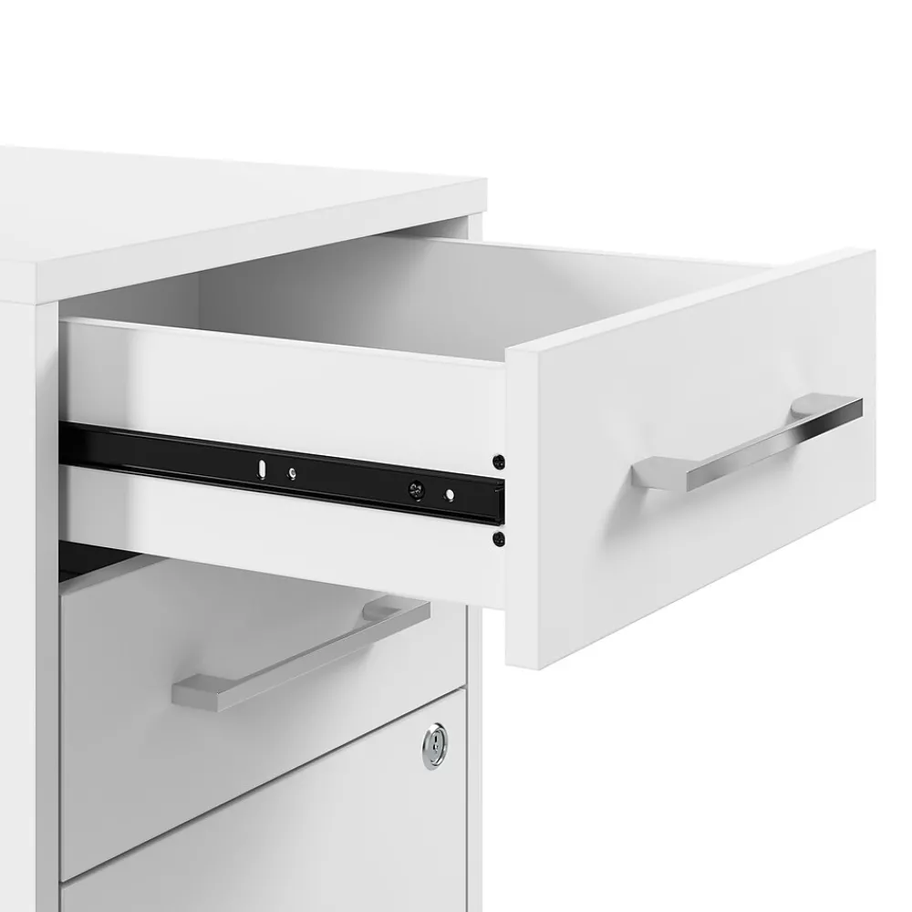 The Bush Business Furniture Hustle Office Storage Cabinet with Wheels provides the form and function needed to support your entrepreneurial spirit without breaking the bank. An ideal choice for small to medium-size businesses and home offices alike, the small cabinet rolls throughout your workspace to provide storage where it’s needed most. The left side features three drawers: one file drawer for letter, legal, and A4-size papers and two box drawers for small office supplies. Drawers can be locked to safeguard sensitive documents as well as valuable items. The office cabinet’s open storage area includes two adjustable shelves for work materials and equipment. This file cabinet with shelves has been meticulously designed and tested to meet or exceed ANSI/BIFMA standards for safety, durability, and performance and is backed by a 10 Year Warranty. American made with U.S. and imported parts.