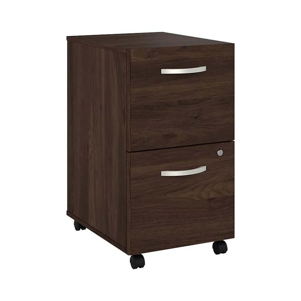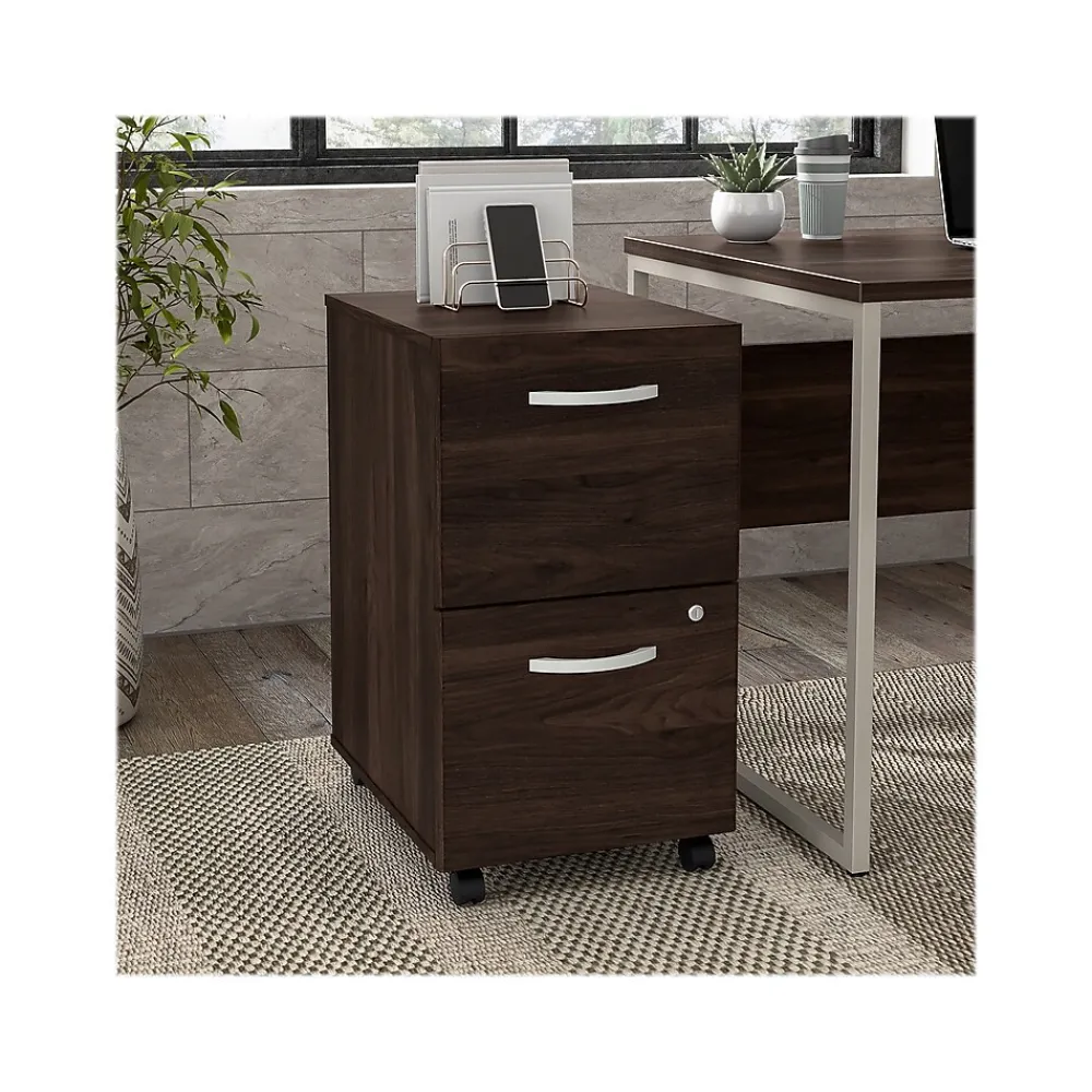 The Bush Business Furniture Hybrid two-drawer mobile file cabinet offers a stylish, long-lasting storage solution for the modern professional. Enjoy a neat and organized workspace with a file cabinet that conveniently rolls wherever you need access to important documents. Drawers open on smooth full-extension ball bearing slides for an effortless reach to letter-, legal-, and A4-size paperwork. Both drawers can be secured by a single lock to protect sensitive files or personal items. The rolling file cabinet’s compact design allows it to fit underneath a standard-size office desk for a space-saving configuration. Find the perfect look for your space with five contemporary finish options: black walnut, modern hickory, platinum gray, storm gray, and white. This two-drawer file cabinet with wheels has been meticulously tested to meet or exceed ANSI/BIFMA quality standards for safety, durability, and performance and is backed by the Bush Business Furniture 10-year manufacturer warranty. See the full Hybrid collection for coordinating items to enhance your workspace as needed, including computer desks, bookcases, and storage cabinets (coordinating items sold separately). American-made with US and imported parts.