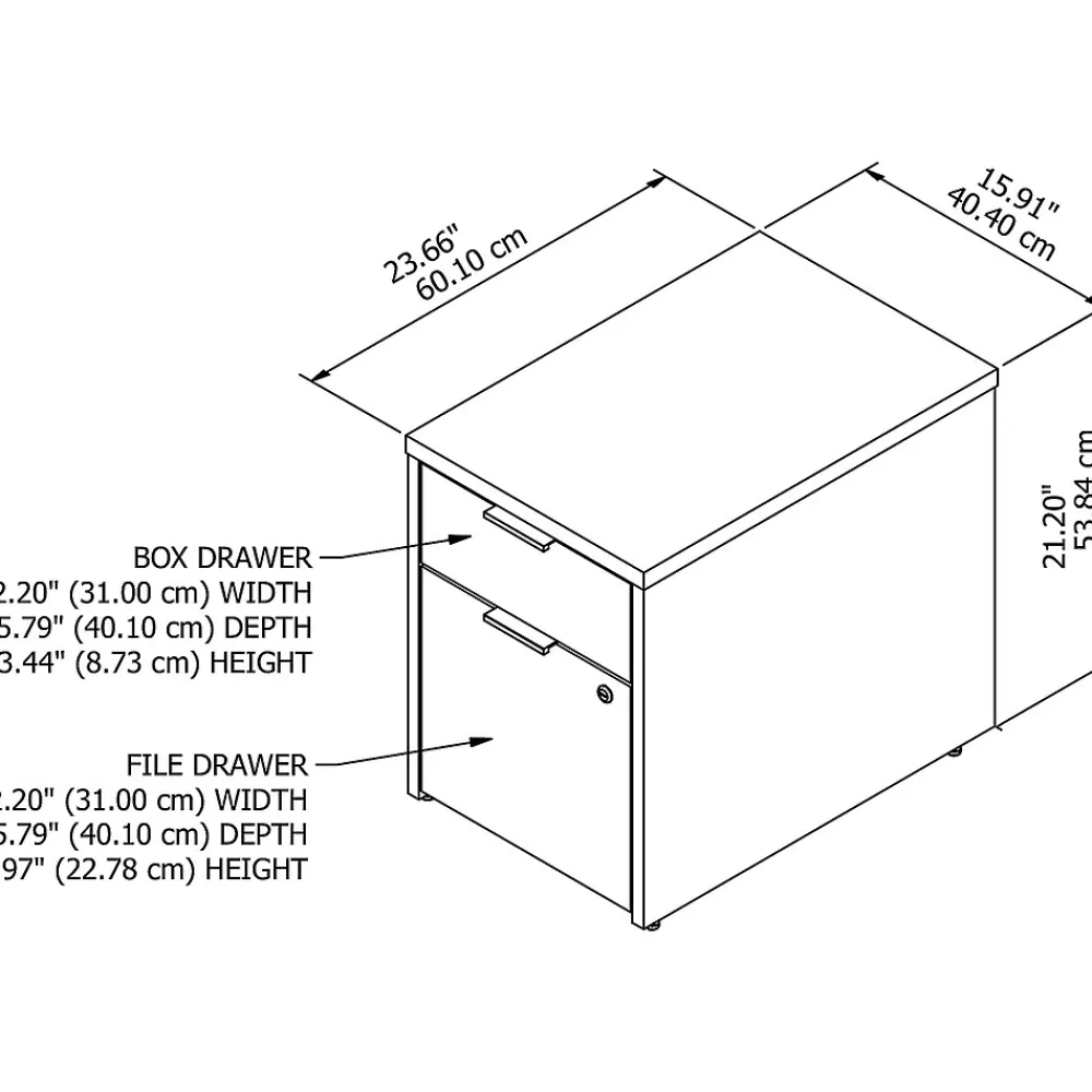 Make storage the foundation of your workspace, or organize items anywhere in the office with the Bush Business Furniture Jamestown two-drawer file cabinet. Keep important work materials organized and secure in any professional space with the Bush Business Furniture Jamestown two-drawer file cabinet. A perfect choice for modern offices, this locking file cabinet can be used on its own or as a base for 60″W and 71″W desk surfaces (sold separately). The file drawer accepts legal-, letter-, and A4-size paperwork while a box drawer organizes small office supplies. A lock secures both drawers so sensitive files and valuable items can be stored safely. Named in honor of Bush Business Furniture’s Western New York headquarters, the Bush Business Furniture Jamestown collection celebrates both the brand’s heritage and its commitment to providing solutions that meet the evolving needs of professional offices. This commercial-grade filing cabinet is tested to meet ANSI/BIFMA quality standards for safety and performance and is backed by a 10-year warranty. American-made with US and imported parts.
