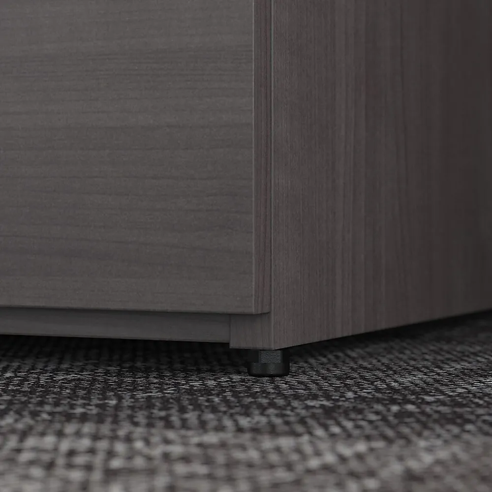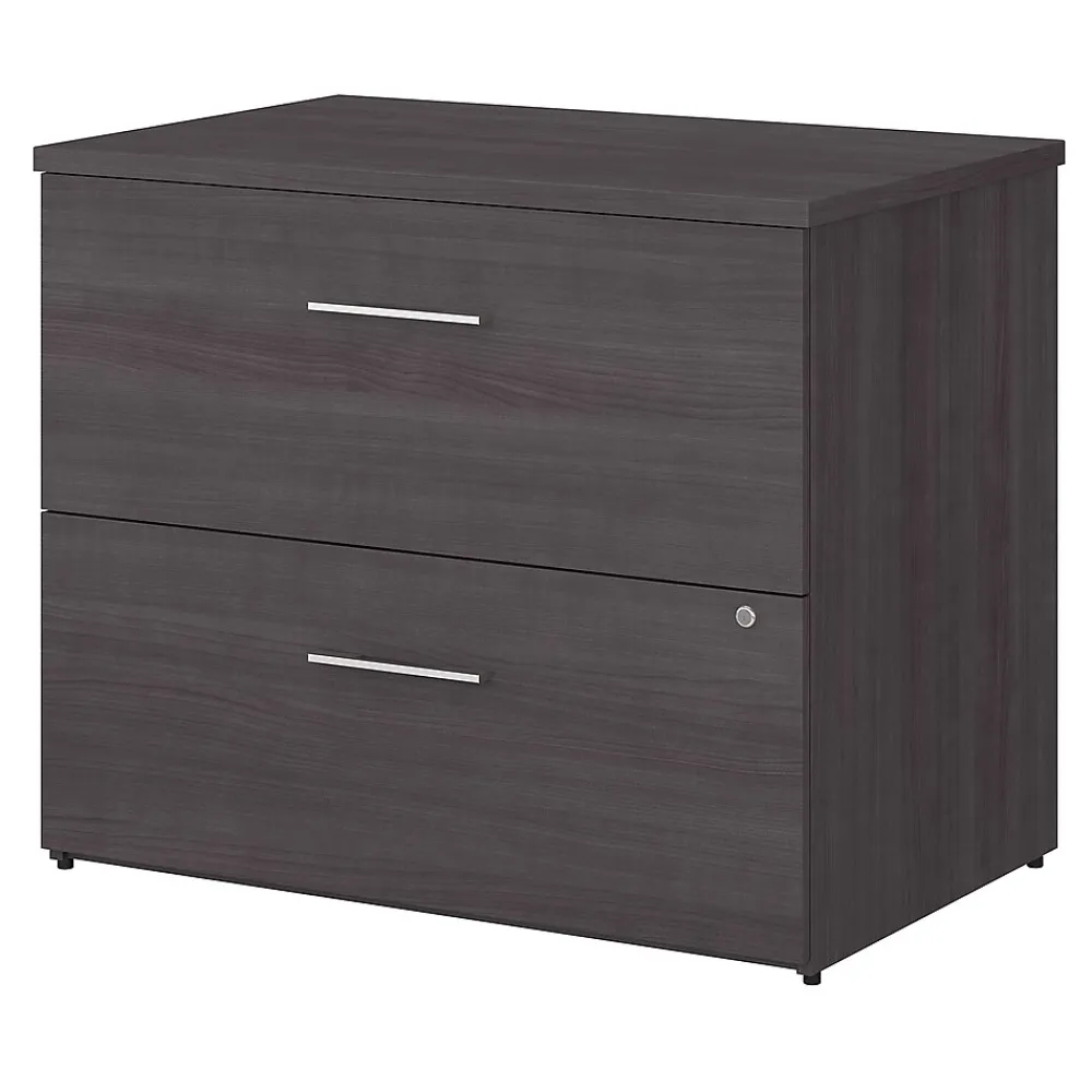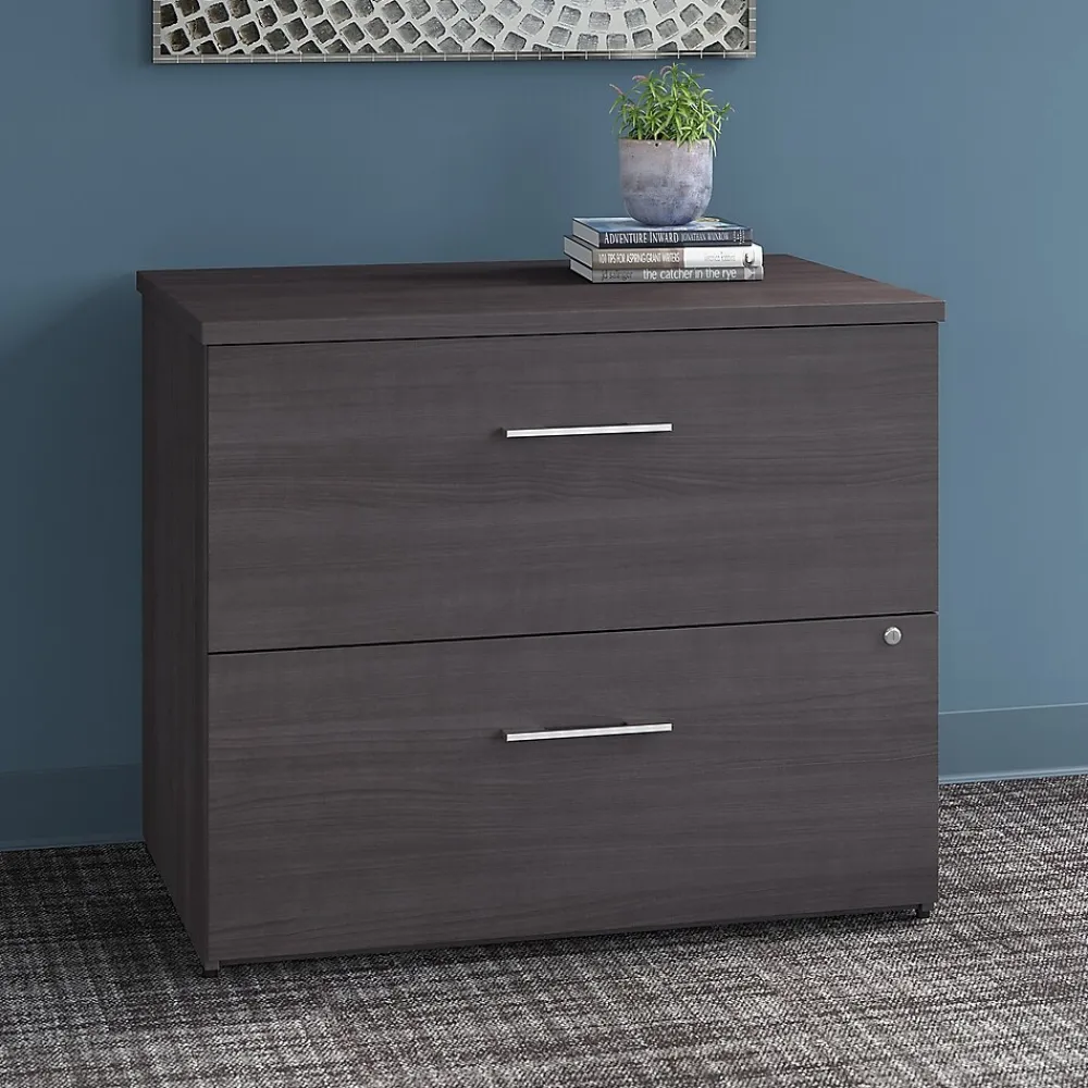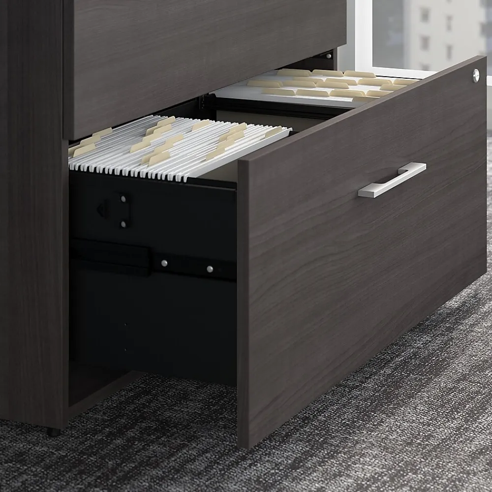 The Bush Business Furniture Office 500 two-drawer lateral file cabinet offers secure storage with a sophisticated look that fits the modern workplace. Organize important paperwork safely and efficiently with this lateral file cabinet. A great addition to any workspace, this file cabinet features two large drawers that accept legal-, letter-, and A4-size documents while supporting up to 88 lbs. each. Both drawers open on full-extension ball bearing slides for an easy reach to contents and are secured by a single lock to protect files that contain sensitive information. Drawers open one at a time for maximum stability, and the base includes adjustable levelers to compensate for uneven floors. One file cabinet accepts the coordinating 36″W bookcase hutch while two can accept a 72″W desk hutch (hutches sold separately). This locking file cabinet meets or exceeds ANSI/BIFMA quality standards for safety and performance and is backed by a 10-year manufacturer limited warranty. American-made with US and imported parts.