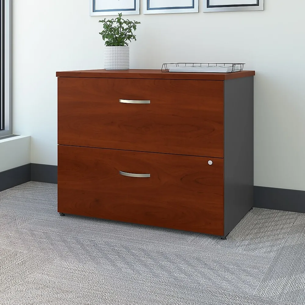 Bush Business Furniture Westfield 36W 2Dwr Lateral File finished in Hansen Cherry for classic styling with clean lines. Enjoy a convenient work and storage solution with file drawers that accommodate letter, legal, and A4 sizes. Full-extension ball bearing slides allow easy access and interlocking drawers prevent against tipping. Utilize the Lateral Files matching height with Westfield desks components to further expand your work surface. Constructed with 100% thermally fused laminate for durability and superior resistance to scratches and stains. Meets ANSI/BIFMA test standards in place at time of manufacture. The Westfield Collection is backed by the Bush Business Furniture 10-Year Warranty. American made with U.S. and imported parts.