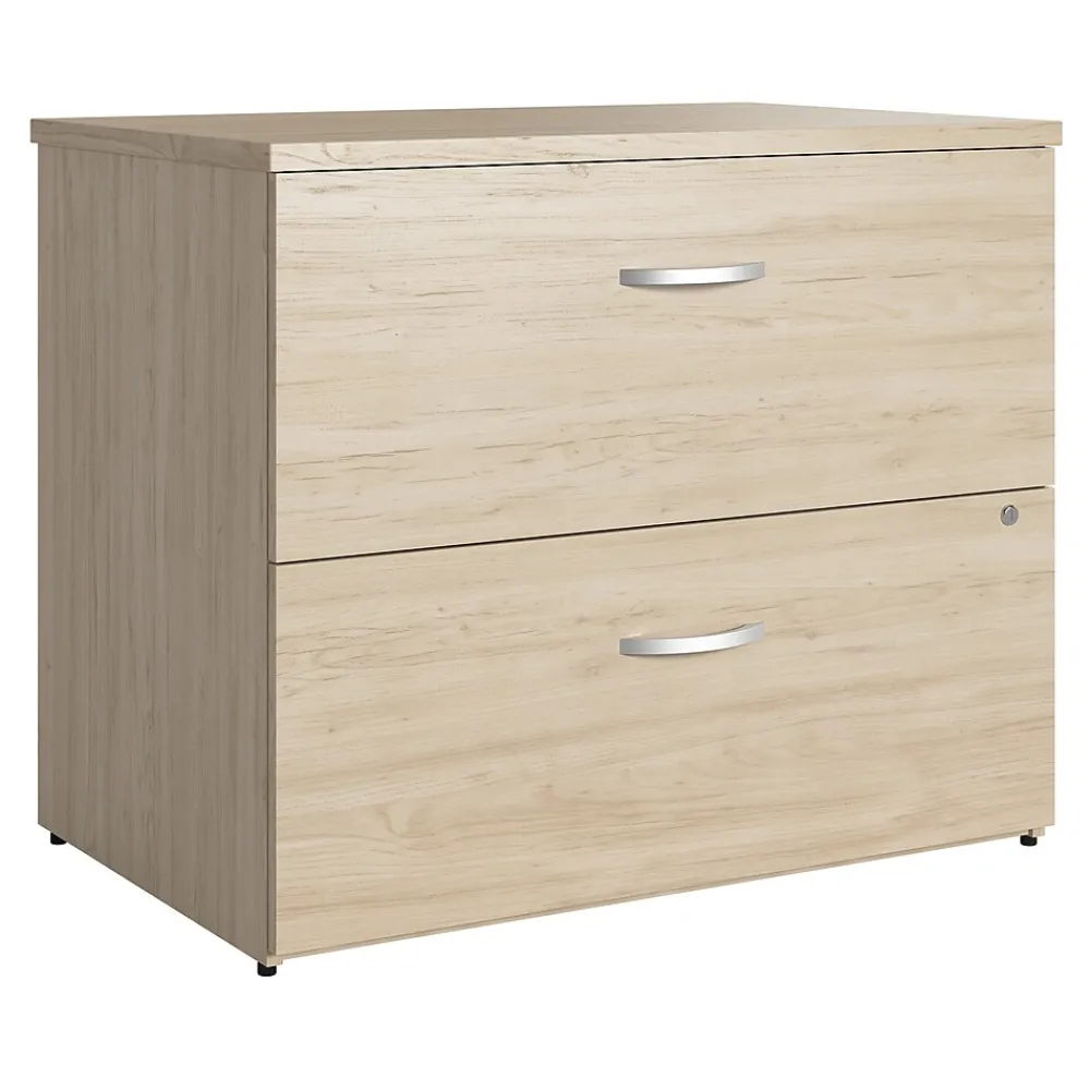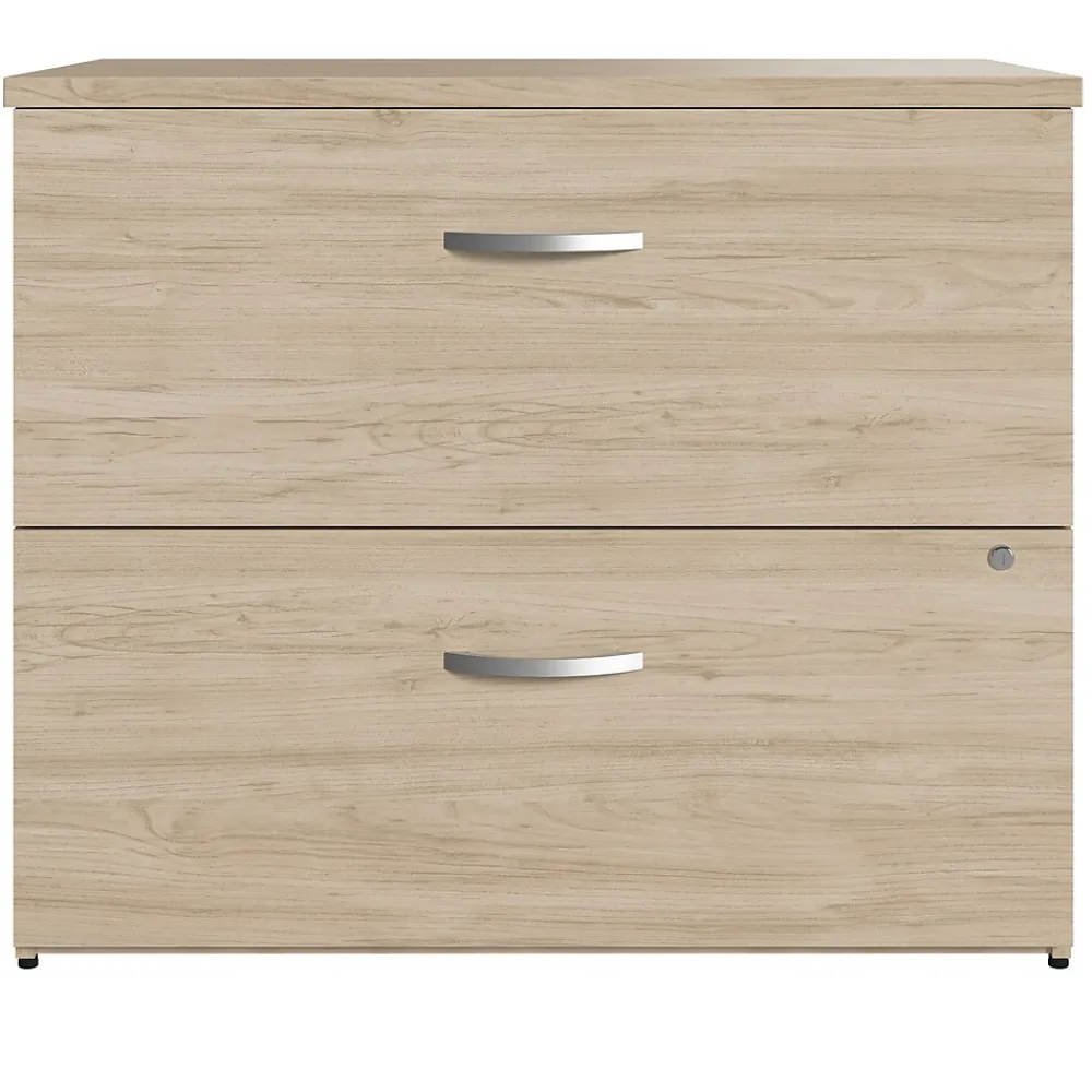 Keep your paperwork under control with the stylish and convenient Bush Business Furniture Studio C 2 Drawer Lateral File Cabinet. Featuring 2 spacious drawers, the filing cabinet ships fully assembled so you’ll be organizing your letter, legal and A4-size documents in no time. Drawers glide on smooth, full-extension ball bearing slides and can be locked to protect sensitive information. Eye-catching Brushed Nickel drawer pulls complement your choice of several contemporary or traditional finishes to make the Lateral File Cabinet as attractive as it is functional. Designed with your comfort in mind, the cabinet matches the height of Studio C desks (sold separately) to extend your workspace when placed side by side. This 2 drawer lateral filing cabinet is backed by a 10 Year Warranty and meets ANSI/BIFMA test standards for safety and performance. American made with U.S. and imported parts.