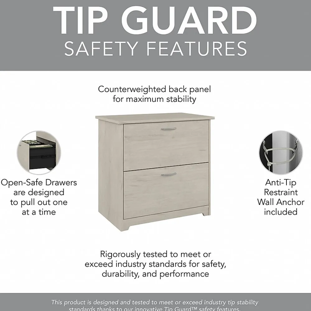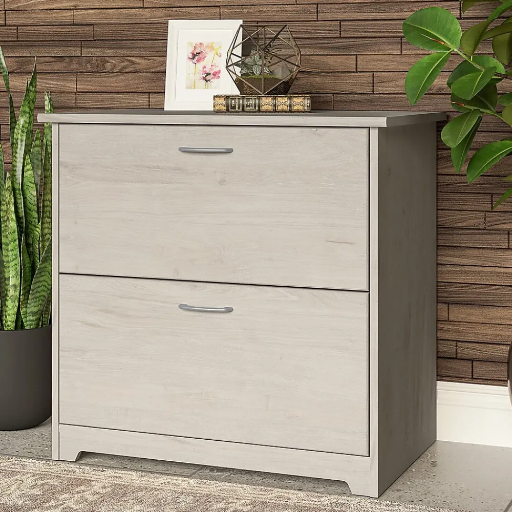 The Bush Furniture Cabot 2 Drawer Lateral File Cabinet is a great way to keep important documents organized and accessible in your home office. Featuring a timeless traditional style, this filing cabinet includes two spacious drawers that accept legal, letter and A4-size paperwork. Both drawers open on smooth full-extension ball bearing slides for an easy reach to contents all the way at the back. The 2 Drawer File Cabinet can also be used with the coordinating Cabot Corner Desk or L Shaped Desk (sold separately) to create an extended work surface when placed side by side. Each drawer is fitted with stylish handles that complement your choice of several attractive finishes to complete the simple, elegant appearance. This 2 drawer lateral filing cabinet is tested to meet ANSI/SOHO standards for safety and performance and is backed by the Bush Furniture 1 Year Manufacturer’s Warranty.