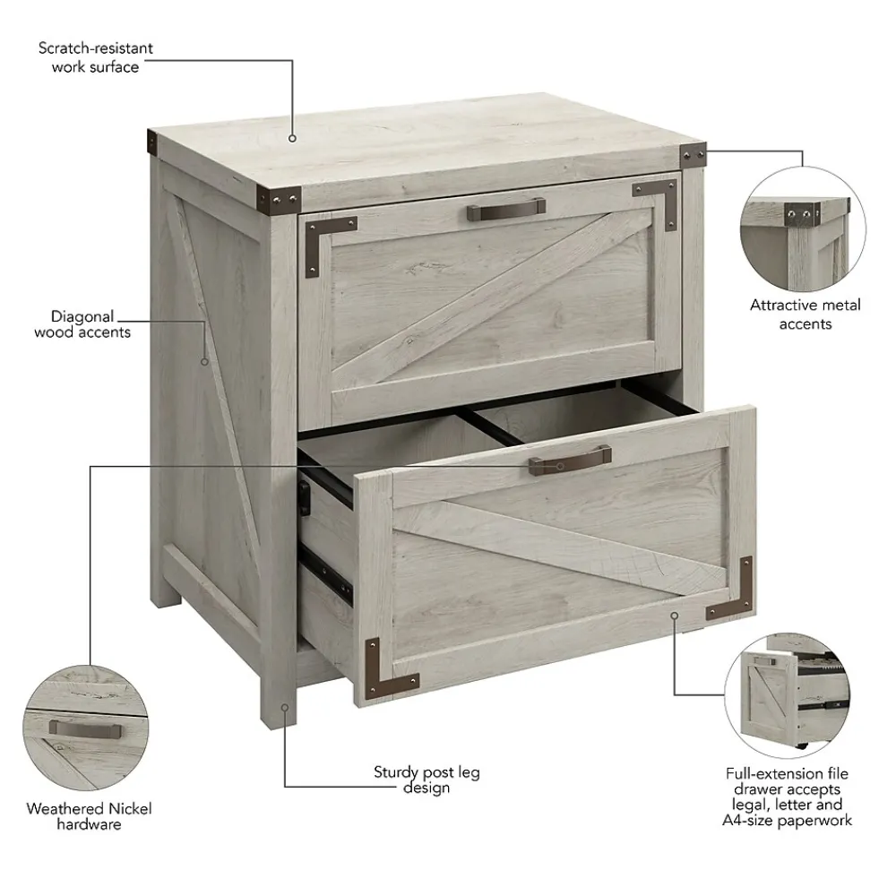 The Bush Furniture Knoxville 2 Drawer Lateral File Cabinet offers a practical storage solution with appealing modern farmhouse style. Take advantage of two large file drawers to keep letter, legal and A4-size paperwork organized in your home office. Drawers support up to 50 pounds of materials each and are designed to open one at a time for maximum stability on any surface. Full-extension ball bearing slides provide an effortless reach to contents, even those all the way at the back. The 2 Drawer File Cabinet matches the height of Knoxville’s 48W Writing Desk and 60W L Shaped Desk to create an extended work surface when placed side by side. This two drawer lateral filing cabinet has been tested to meet ANSI/SOHO standards for safety and performance and is backed by a 3 Year Manufacturer’s Warranty. See the full collection for coordinating items available.