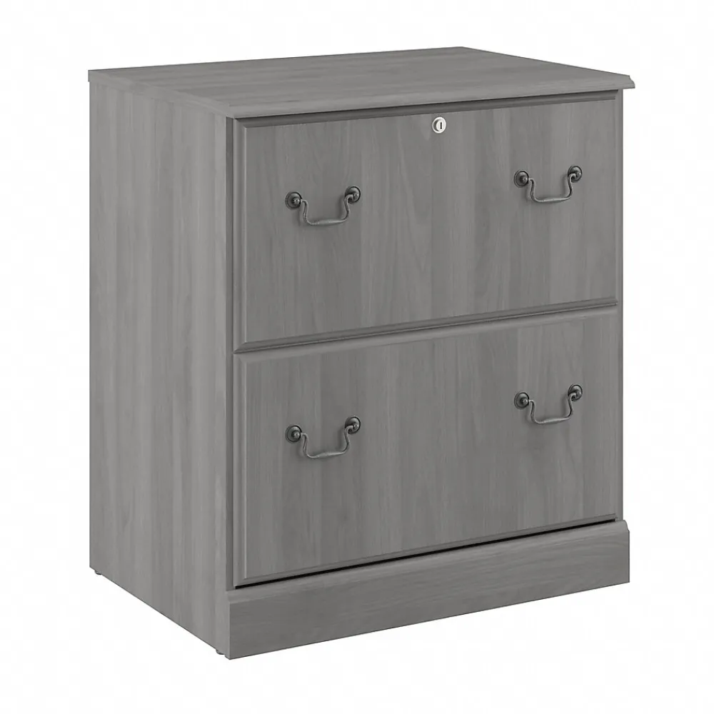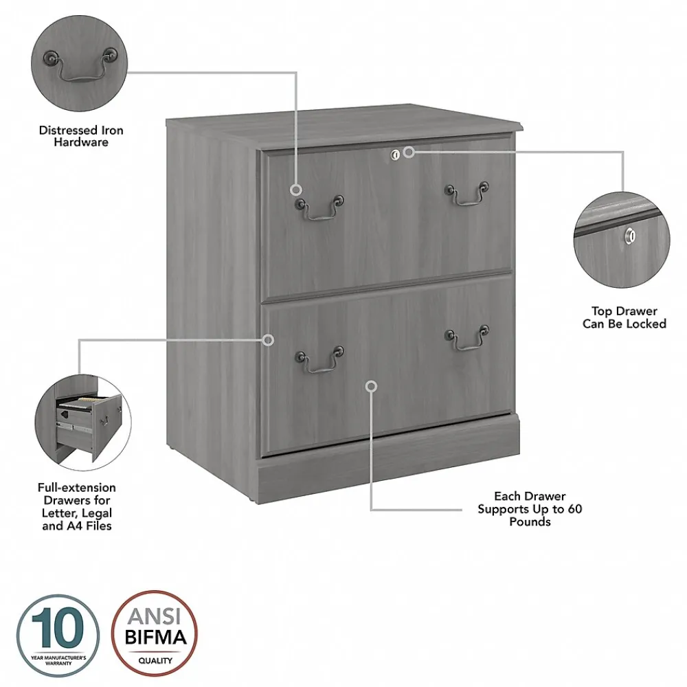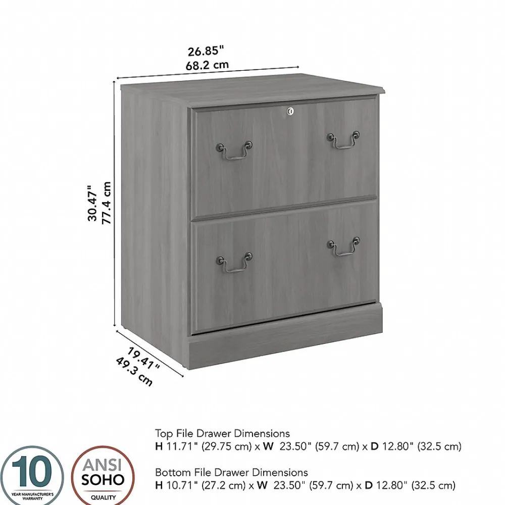 Enjoy the refined elegance of timeless traditional styling while keeping paperwork in order with the Bush Furniture Saratoga two-drawer lateral file cabinet. A perfect choice for virtually any office or private study, the file cabinet features two spacious file drawers that accept letter-, legal-, and A4-size documents. Drawers open on smooth full-extension ball bearing slides for an effortless reach to contents and are designed to extend one at a time for maximum stability. Each drawer holds up to 60 lbs. of materials, and the upper drawer can be locked to protect your personal information and other sensitive paperwork. The two-drawer file cabinet’s classic appearance is enhanced by decorative edge details and old-fashioned drop handle drawer pulls. This locking file cabinet has been tested to meet ANSI/BIFMA quality standards for safety and performance and is backed by a 10 Year Manufacturer’s Warranty.