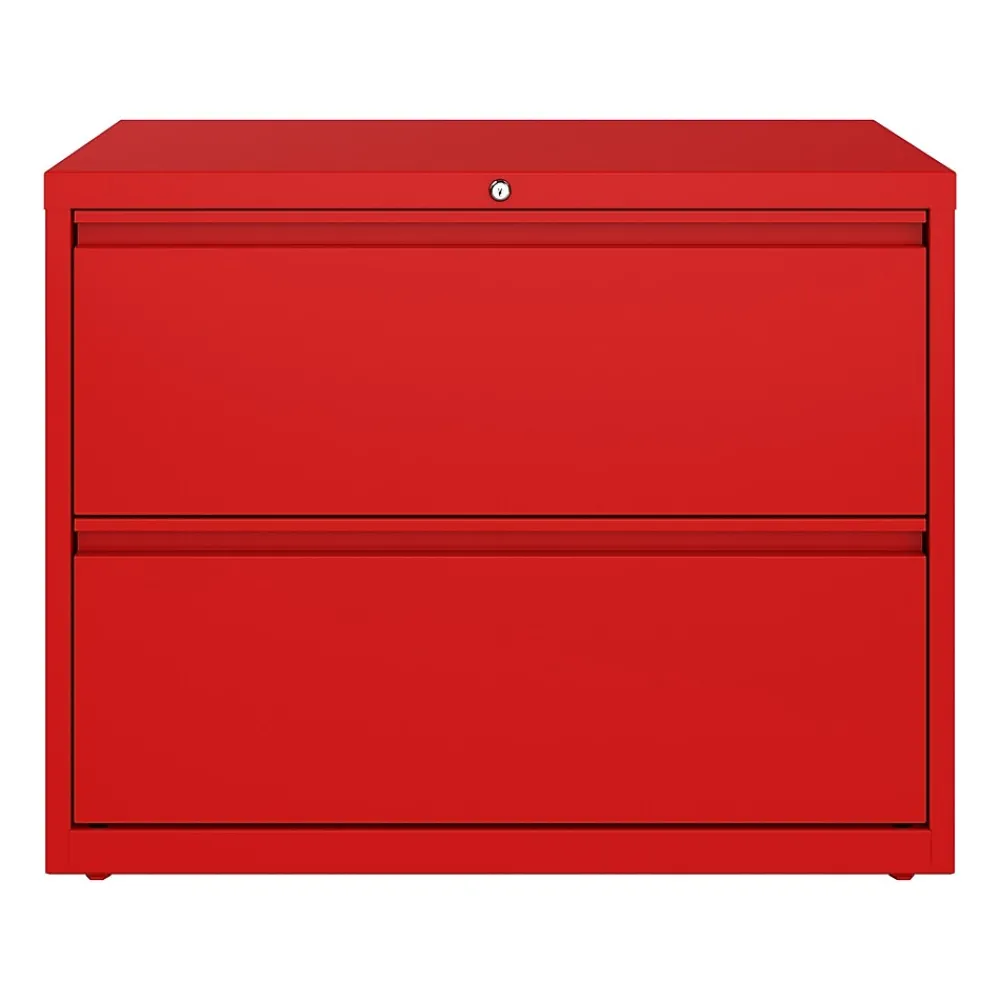 This 36 in. wide 2 drawer commercial grade lateral filing cabinet is designed for heavy duty use, yet looks great in any office. Precision ball-bearing suspension allows for quiet use in your busy office environment. Fully assembled steel construction with reinforced base. Non-porous surface is easy to clean. Interlock system prevents tipping by only allowing one drawer open at a time. Dual lock bars and core-removable lock come standard. Unit includes hang rails, magnetic label holders, and four adjustable leveling glides. Greenguard Gold certified for indoor air quality. Meets or exceeds ANSI-BIFMA standards. TAA compliant. Limited Lifetime Warranty.