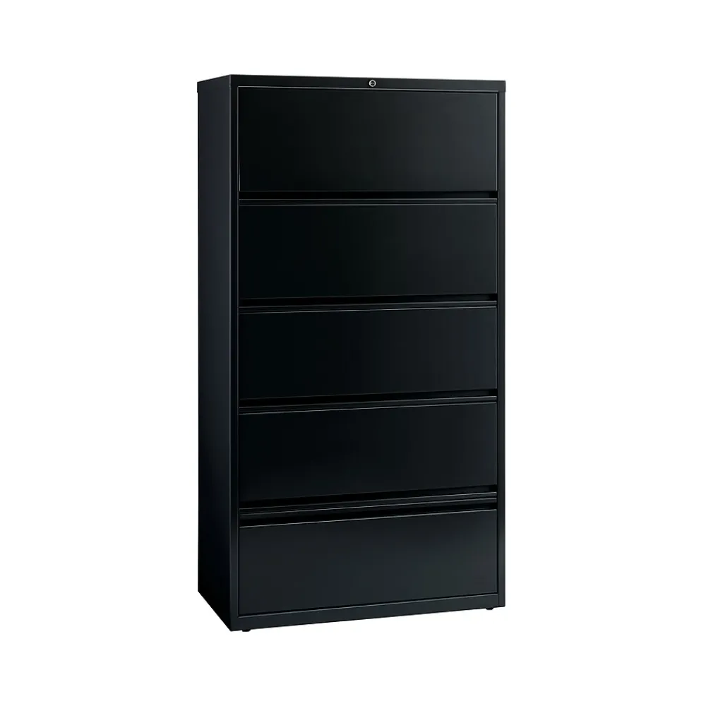 - Five-drawer lateral file cabinet with rollout shelves holds letter-, legal-, or A4-size documents
