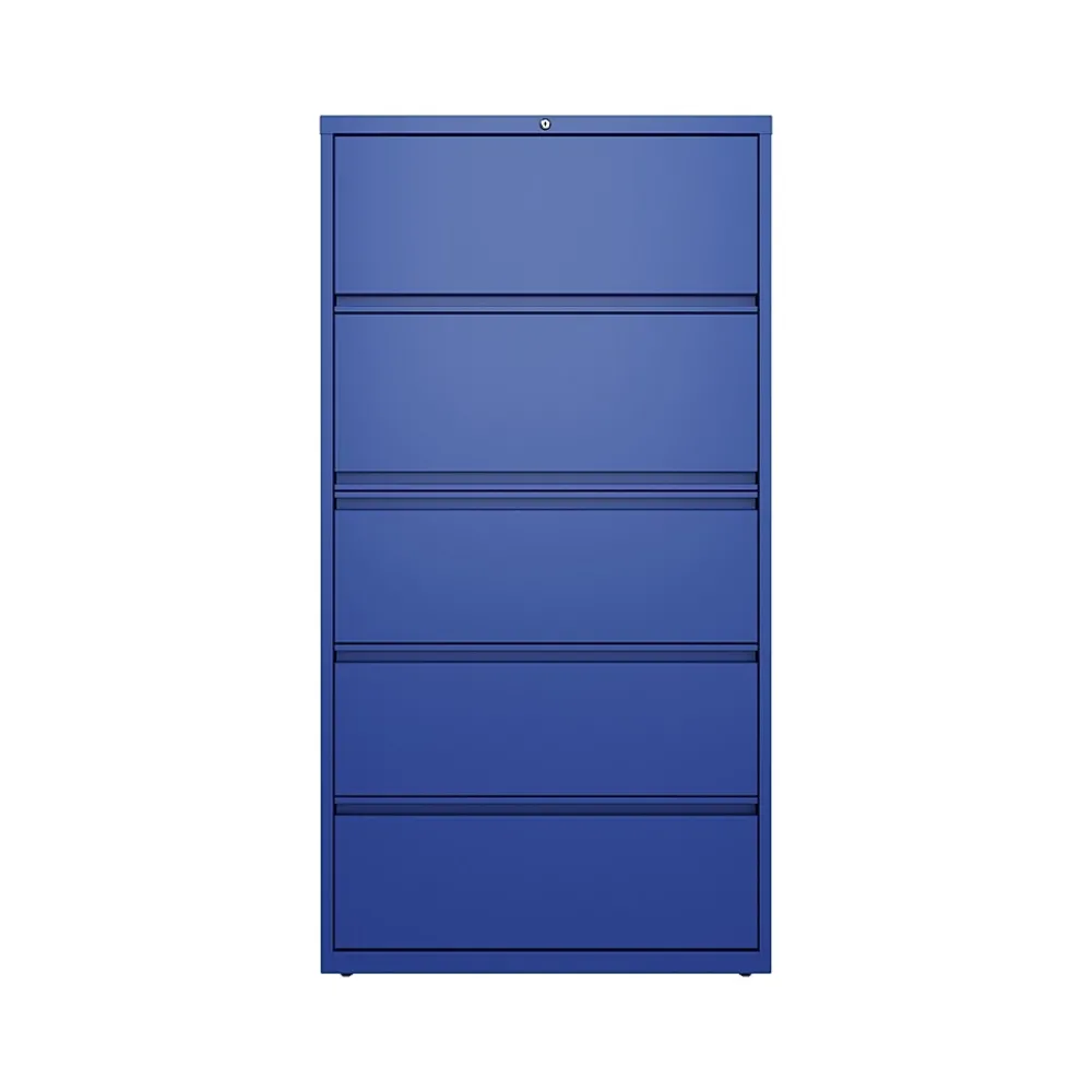 - Five-drawer lateral file cabinet holds letter-, legal-, or A4-size documents