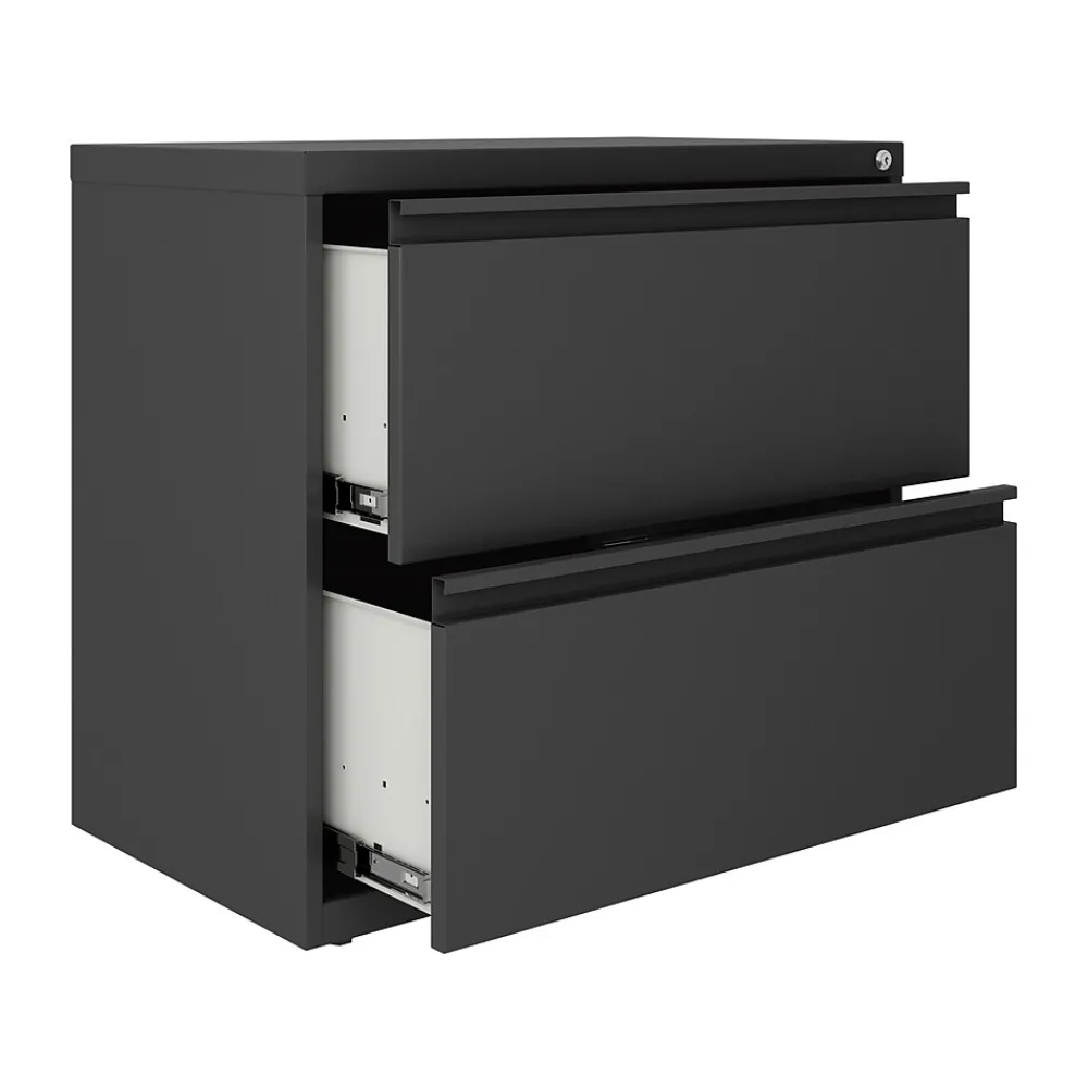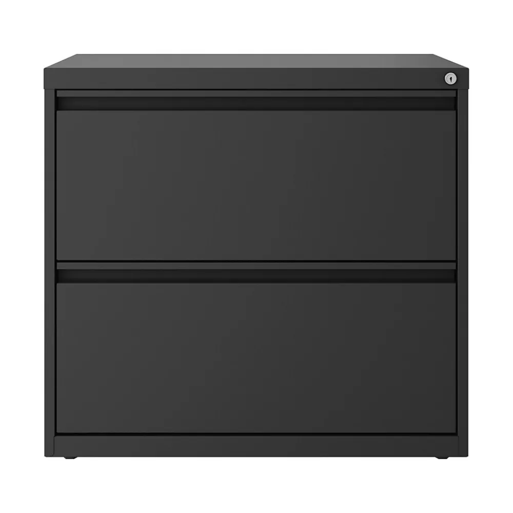 - Two-drawer lateral filing cabinet designed for letter- and legal-width hanging files