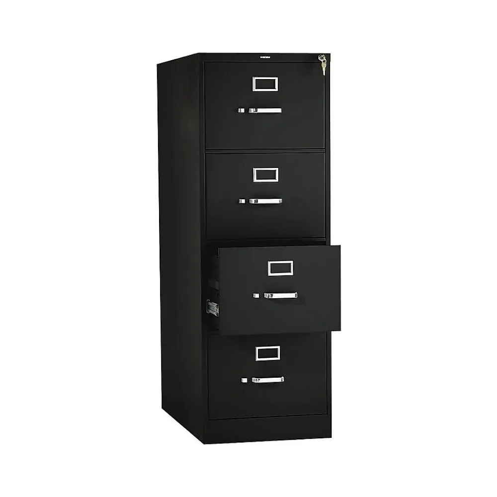 - Four-drawer vertical filing cabinet holds legal-size documents