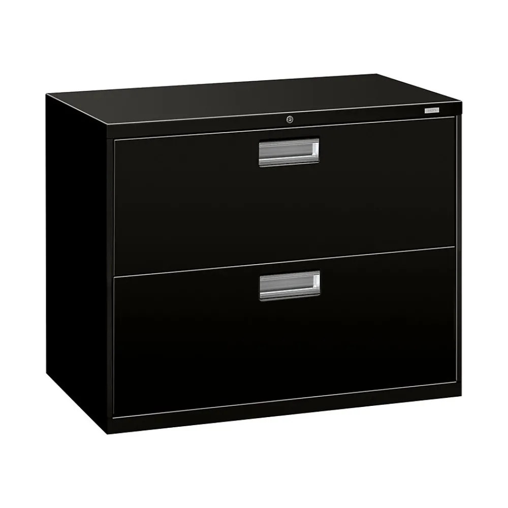 - Two-drawer lateral filing cabinet holds letter- or legal-size documents