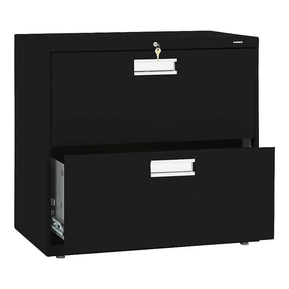 Keep paperwork organized with this HON 600 series two-drawer lateral file cabinet. Its durable steel frame can stand up to everyday use, and the two drawers operate smoothly and quietly thanks to ball bearing suspensions, while a mechanical interlock prevents multiple drawers from opening at the same time. With a two-sided lock mechanism and removable lock core, this HON Brigade 600 series lateral file keeps sensitive documents securely tucked away.