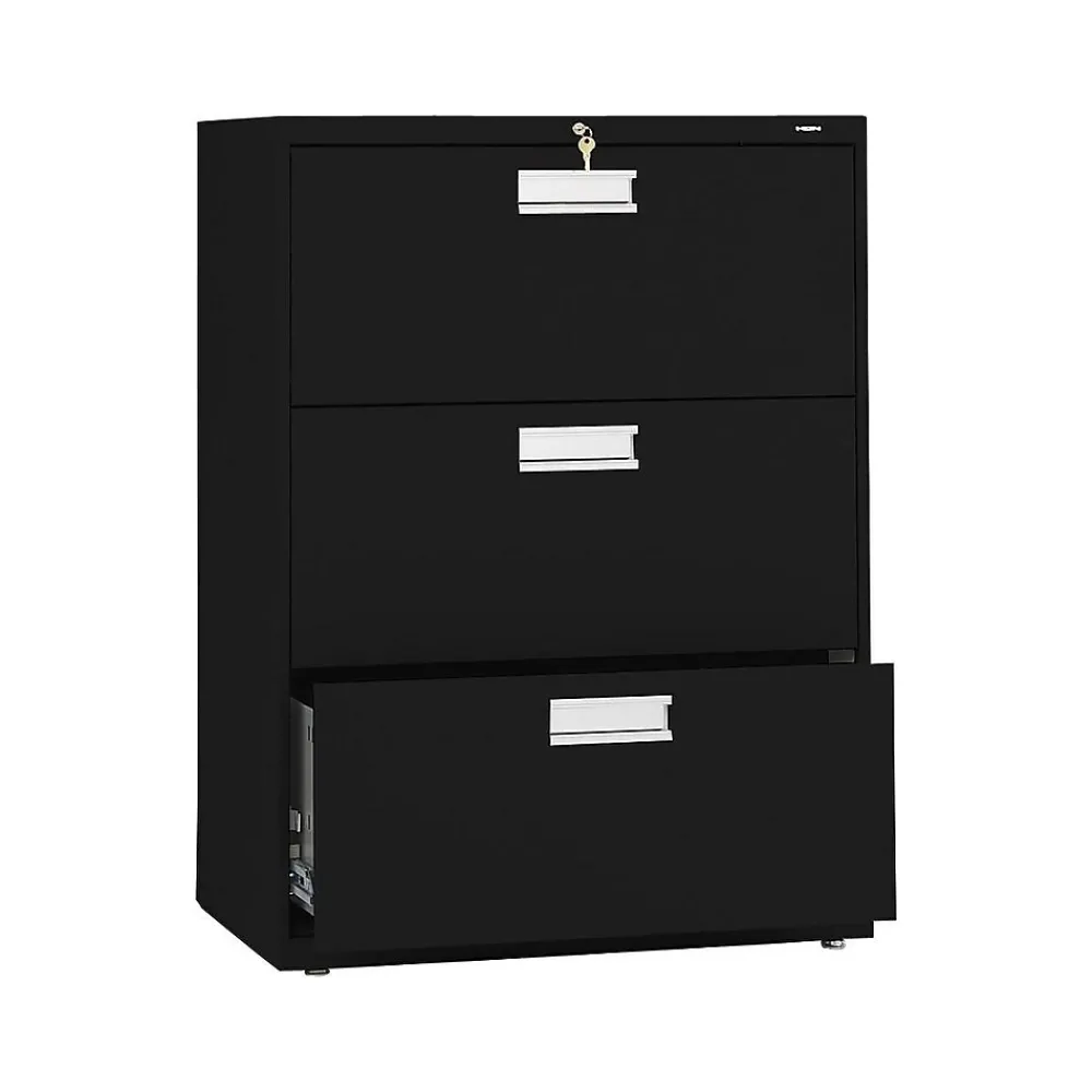 - Three-drawer lateral filing cabinet holds letter- or legal-size documents