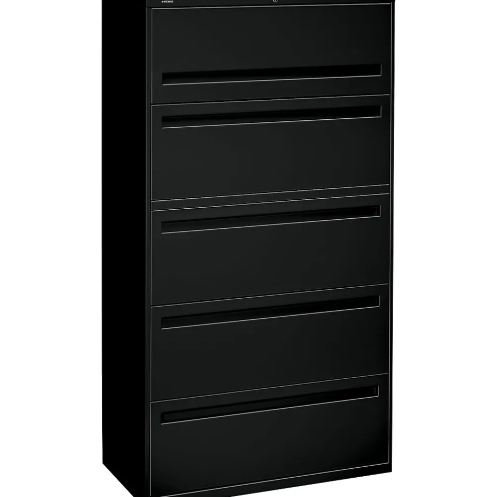 HON® Brigade™ 700 Series 36″ Lateral file cabinet in black color features steel ball bearing drawers that can be operated easily and quietly. Cabinet consists of mechanical interlock and measures 67″ x 36″ x 19 1/4″.