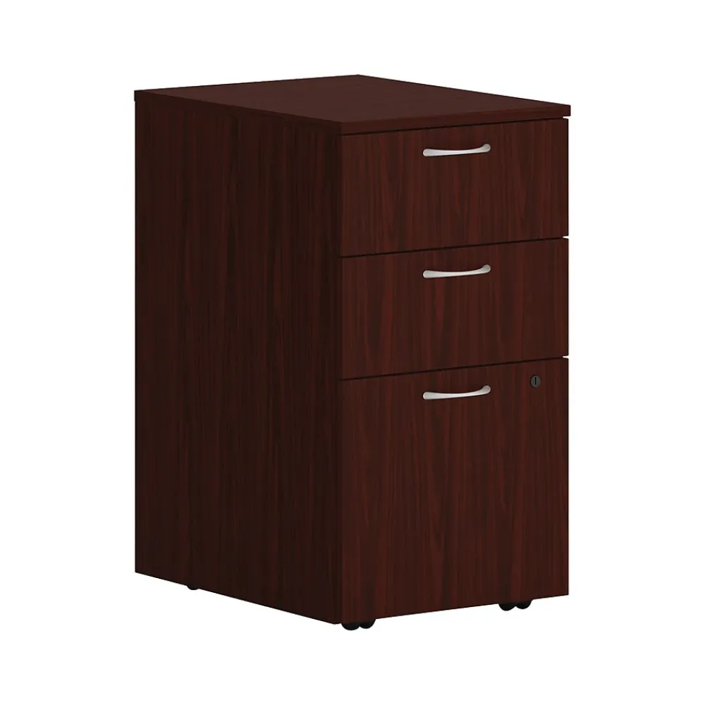 - Three-drawer mobile pedestal cabinet includes two box drawers for supplies and one file drawer for documents