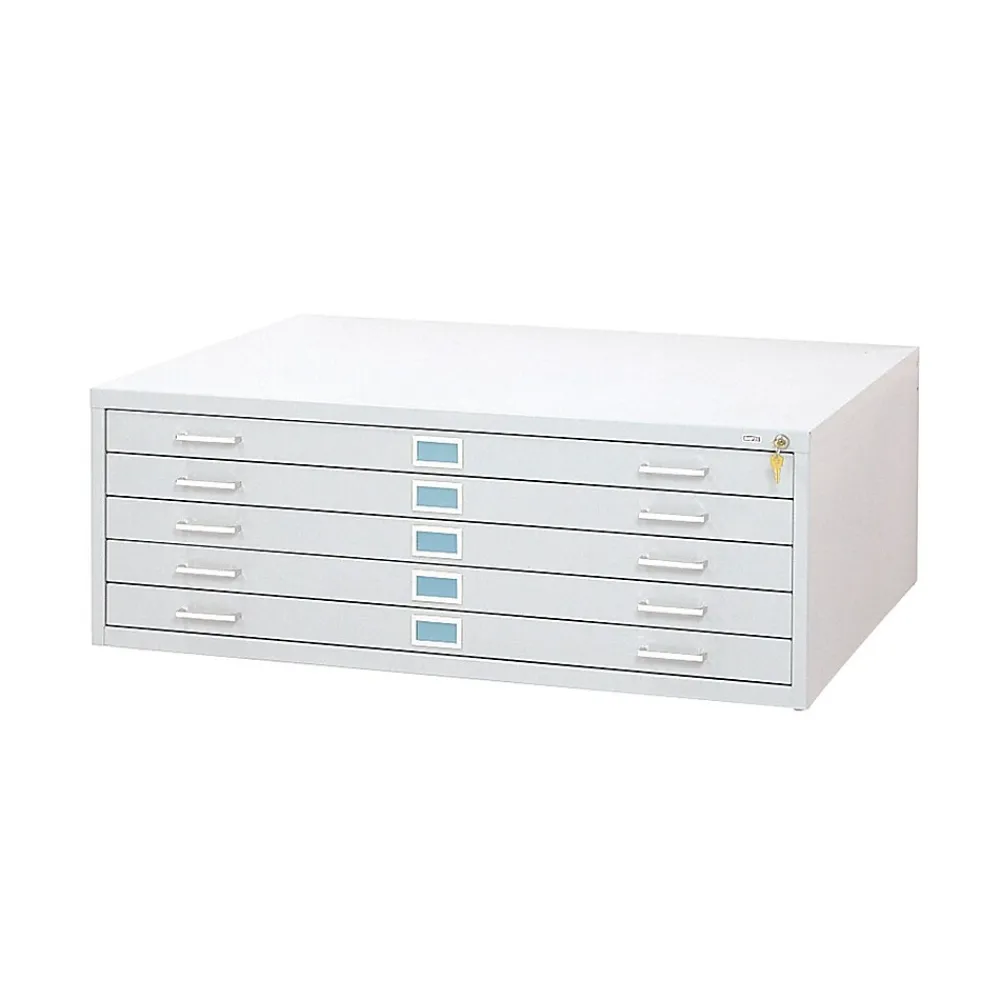 Safco 5-Drawer steel flat file for 36″ x 48″ documents in steel construction features positive closures to keep drawers tightly shut and courtesy stops to keep them in place while open. Rear hood and hinged front depressor keeps the contents clean.