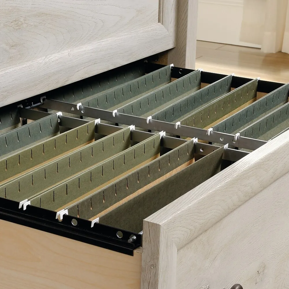 - Drawers with full extension slides hold letter or legal size hanging files.