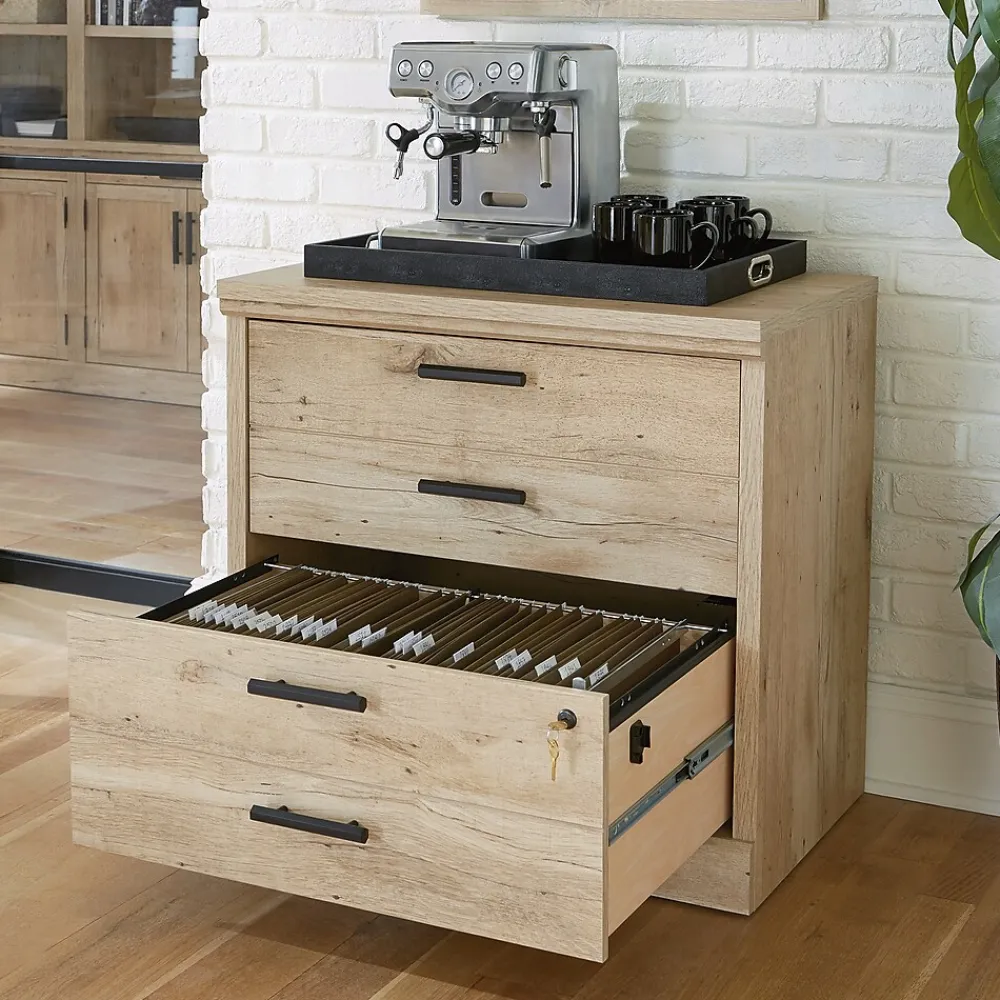 Your papers deserve more than being shoved in a drawer only to be forgotten about or disappear when you need them most. The Mason Peak lateral file cabinet will make sure you never go scrambling for that missing document ever again. With drawers that fully extend and hold letter, legal or European size hanging files, all your important documents are readily available at your fingertips. Your files will be secure with the drawer key locks on this wood lateral file cabinet. Safety is on our minds, and the interlocking safety mechanism of this 2 drawer lateral file cabinet allows only one drawer to open at a time. Your time is precious. That’s why this wood lateral file cabinet comes fully assembled with minimal hardware attachment required. Commercial filing cabinets are a centerpiece in the best offices, and this file cabinet is finished on all sides for a polished look from every angle. Finished in a light Prime Oak, commercial office storage has never looked so good.