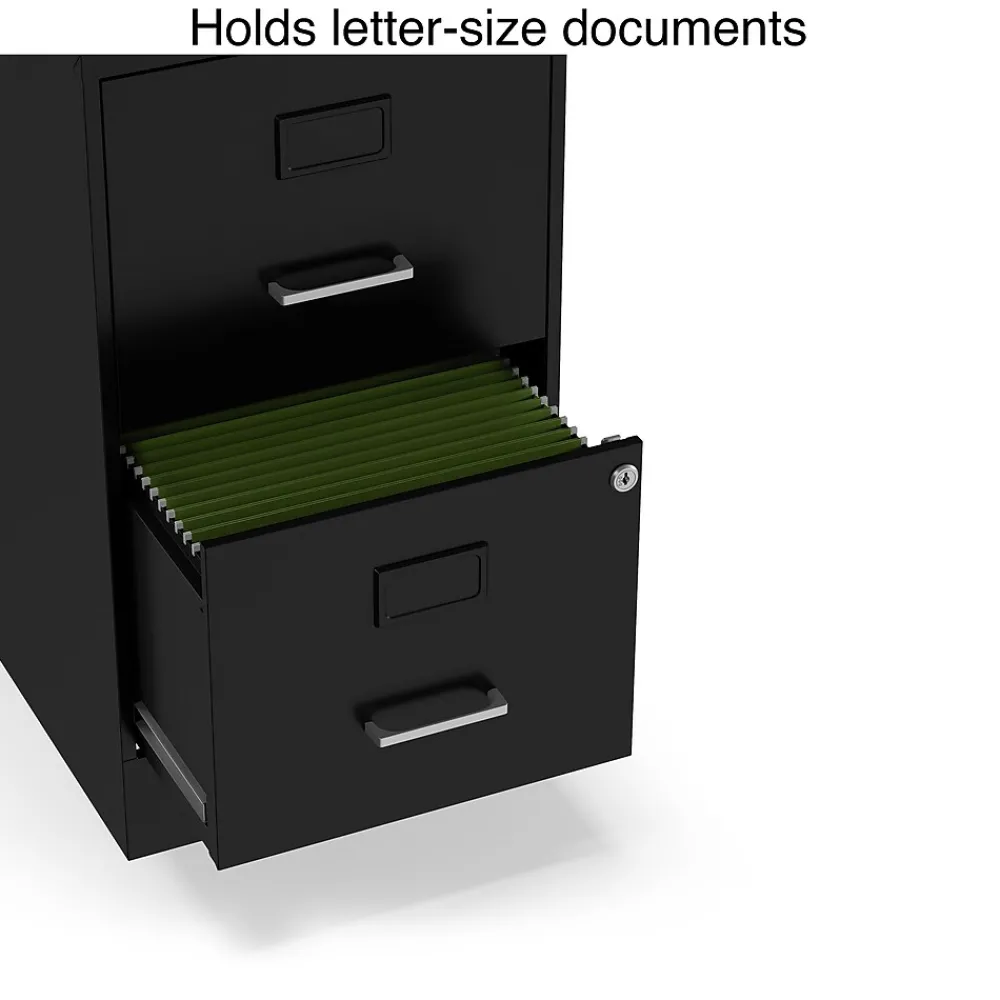 Keep documents accessible with this light duty vertical file cabinet. Integrated label holders let you categorize paperwork stored in each of the two drawers, and convenient handles make the drawers easy to open. With a compact size, this cabinet fits neatly in small work spaces. A keyed lock keeps important papers and personal items stored securely inside. This letter-size vertical file cabinet boasts a flat top surface, which offers convenient space for a printer, a fax machine or other office essentials.