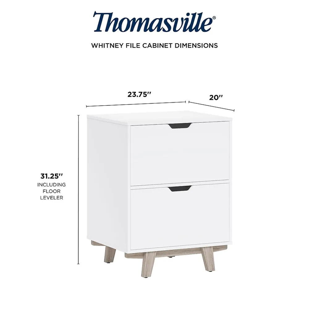 The Thomasville Furniture Whitney two-drawer lateral file offers a chic mid-century modern look with its crisp white finish featuring an antimicrobial laminate along with a solid wood base. The antimicrobial finish reduces the growth of bacteria on the surface. Two horizontal file drawers will keep your workspace free of clutter. This Whitney lateral file pairs perfectly with the Thomasville Furniture Whitney 48″ desk as well as the Thomasville Furniture Whitney bookcase to complete your office renovation.