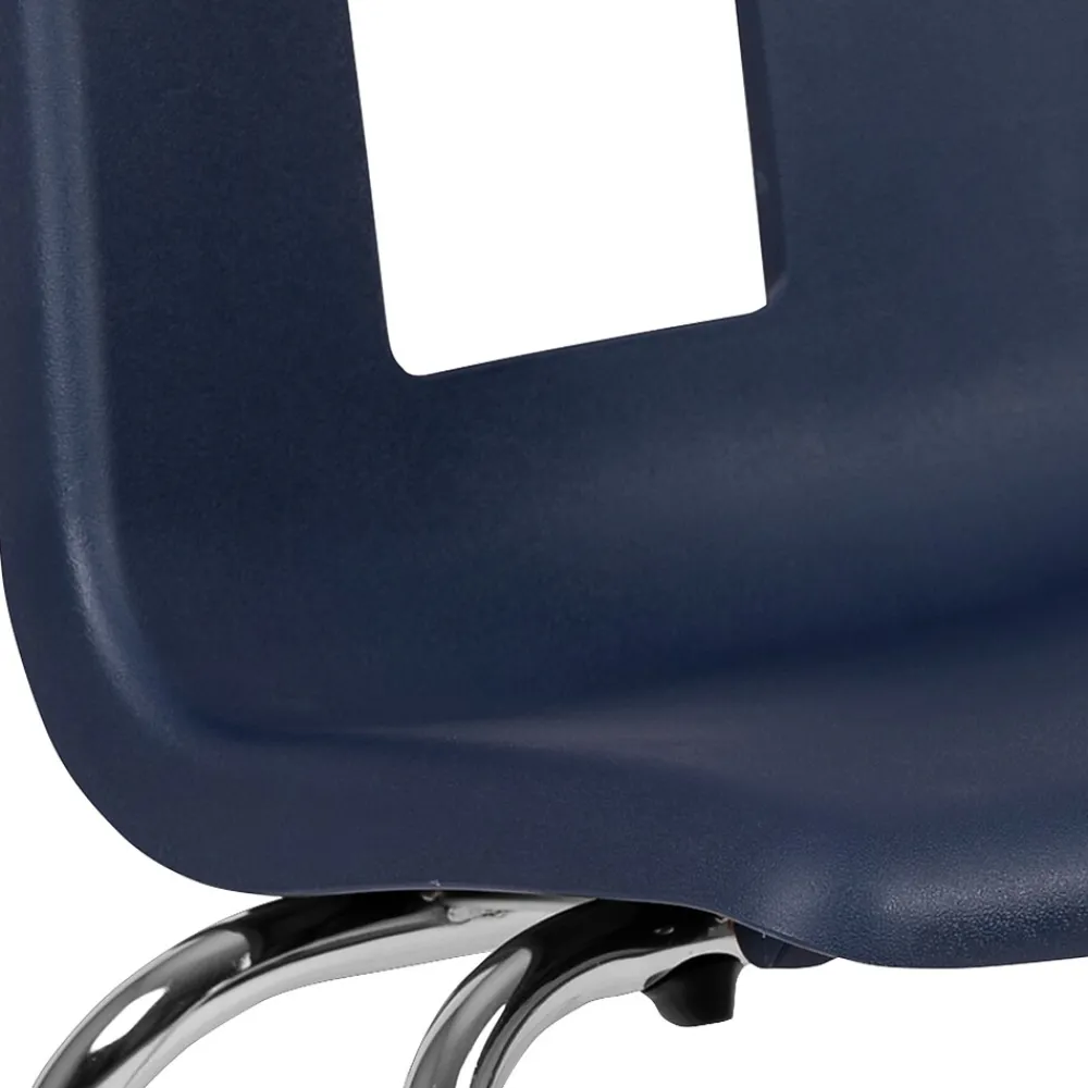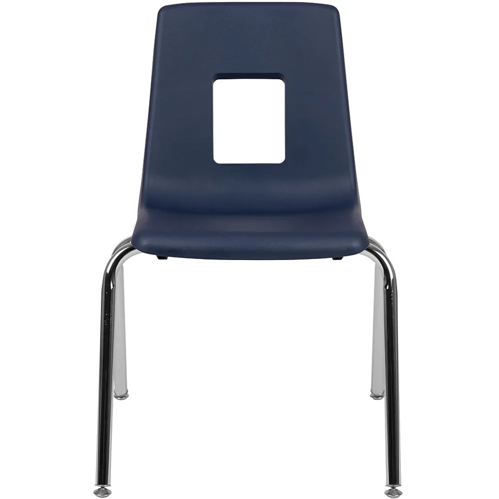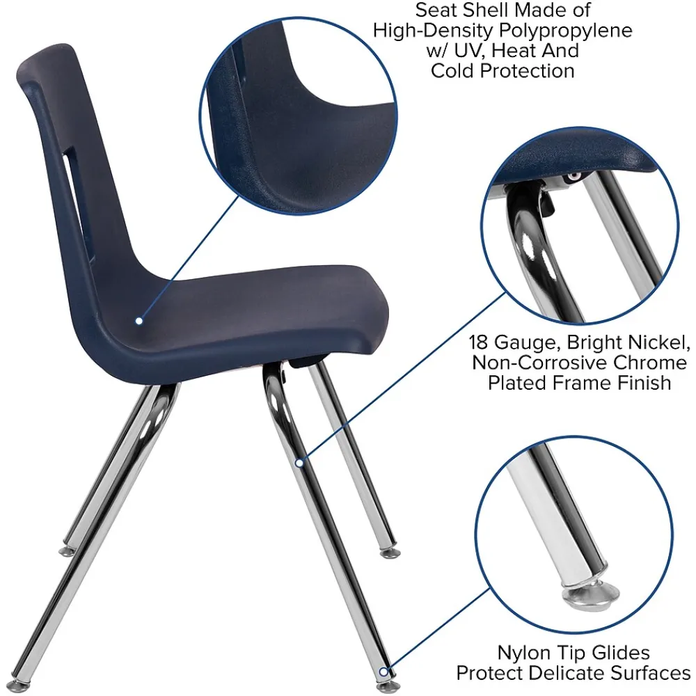 The classroom oriented student stack school chair features a heavy-duty navy seat shell made of superior high-density polypropylene, ergonomically shaped for maximum student seating comfort and 18-gauge bright nickel, chrome plated frame. The seat shell is designed to promote student seating comfort and correct seating posture for enhanced learning. Non-exposed rivets hold the school chair shell to the strong, non-corrosive steel frame while nylon tip glides on each leg help protect delicate floor surfaces. This ergonomic stack chair provides a stylish and durable classroom seating solution.