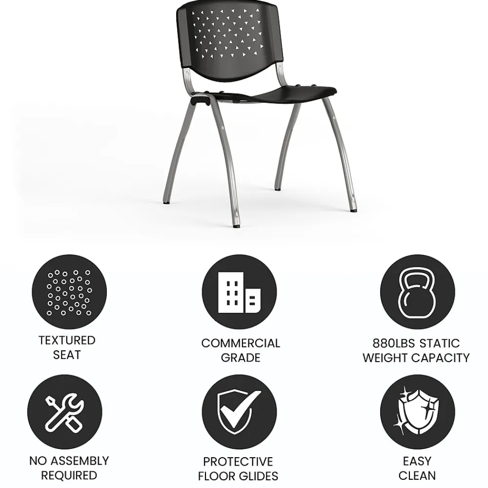 When you need to seat guests in your hair salon, barbershop, or tire shop this plastic stack chair will bring comfort to guests waiting for service. Guests will love the wider seat design that is curved for comfort. The ergonomic design provides angled seating for your visitors to recline while reading a book or scrolling through their phone. Setup training rooms or arrange for guest speakers placing several plastic chairs in a row or around tables. The chair features a perforated back, textured seat and a titanium gray finished powder coated frame that holds up to 880 pounds. Whether you need to furnish a small or large business there’s no job that this heavy-duty plastic guest chair won’t be able to handle. These black plastic stack chairs stack up to 25 chairs high and can be transported across the facility on our steel stack chair and church chair dolly.