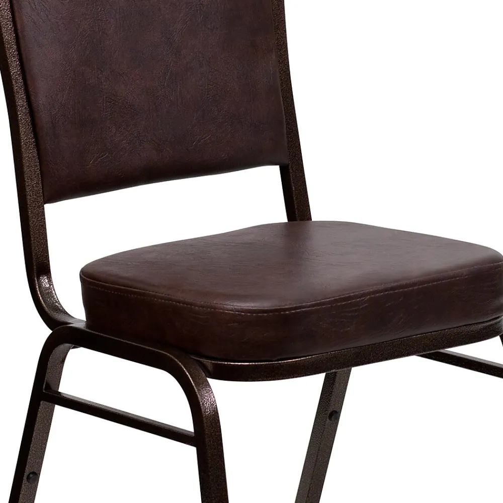 Make an impressive presentation in your banquet hall when clients come to visit your facility with these ballroom chairs. Built for the commercial industry these popular crown back banquet chairs with 16 gauge steel frame have been tested to hold up to 500 pounds. With a high seating capacity these stack chairs are perfect for the event rental business, banquet halls, churches, and schools. This hospitality chair can be dressed up with chair covers. The chair is cushioned with 2.5″ thick CAL 117 fire retardant foam and is covered in a durable, easy to clean vinyl upholstery. Bumper guards prevent scratches on the frame when stacked (up to 15 high) and non-marring floor glides protect your floor. This stacking upholstered stack chair is an excellent option for any commercial setting. Add banquet chairs to your home dining table to add a contrasting look to your dining room or kitchen.