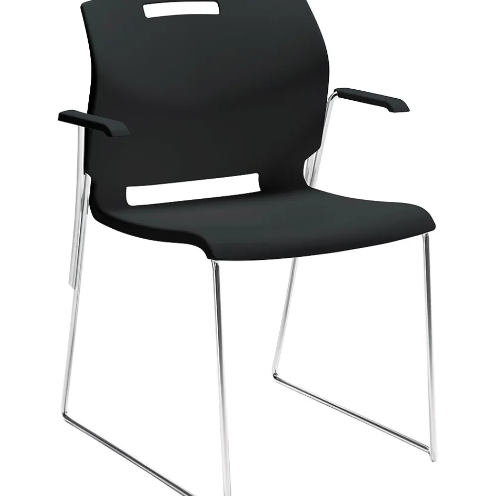 Folding & Stacking*Global Popcorn Stack Chair with Arms, Plastic, Asphalt Black, Seat: 18″W x 18″D , Back: 19.5″W x 16″H