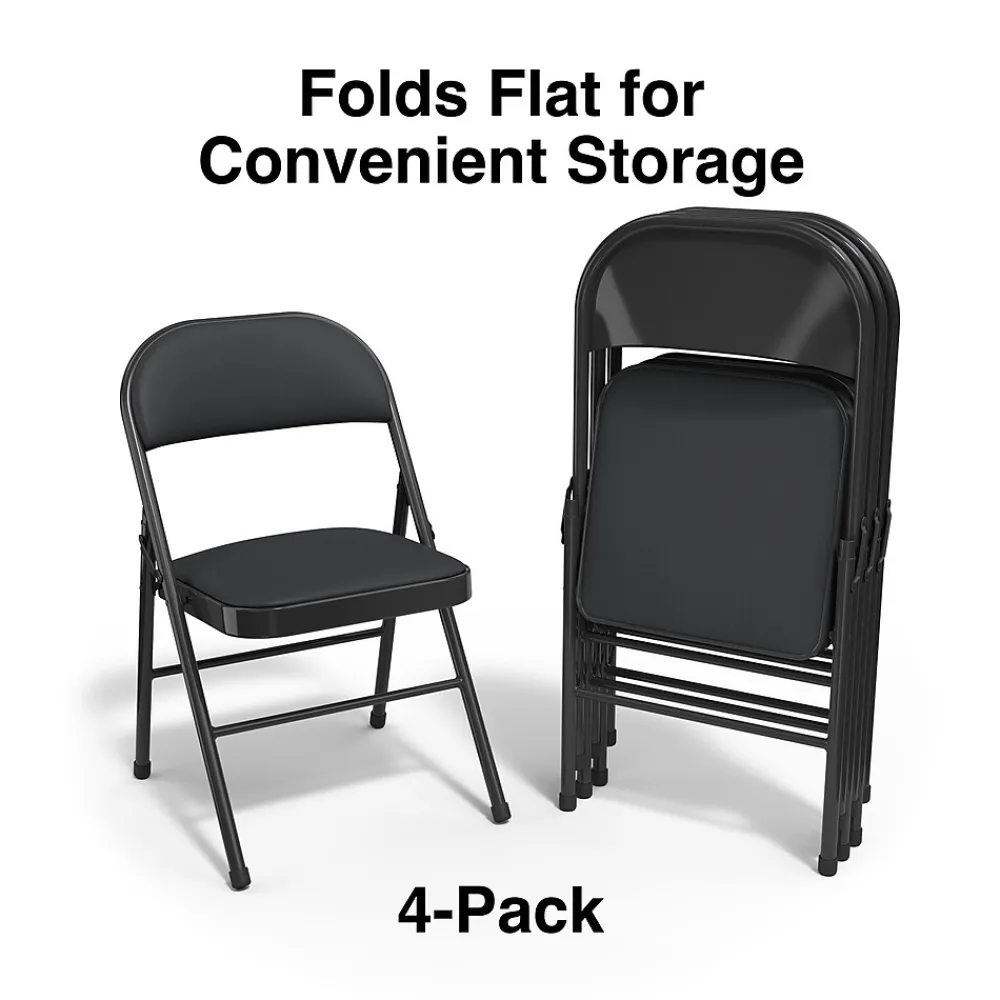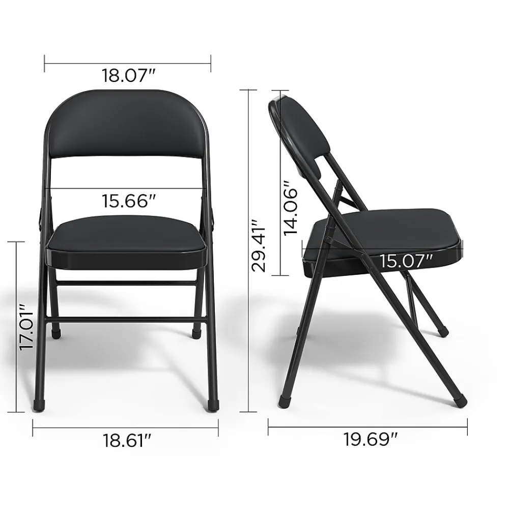 Set up a flexible seating area with this metal folding chair. The lightly-padded seat and seat back offer added comfort, while the Luxura upholstery offers an upscale appearance. A sturdy metal frame offers durability for all-day use, providing an ideal option for use in business meetings, parties, or other special events. This black folding chair folds flat for easy storage, so it tucks away neatly in a closet or storeroom.
