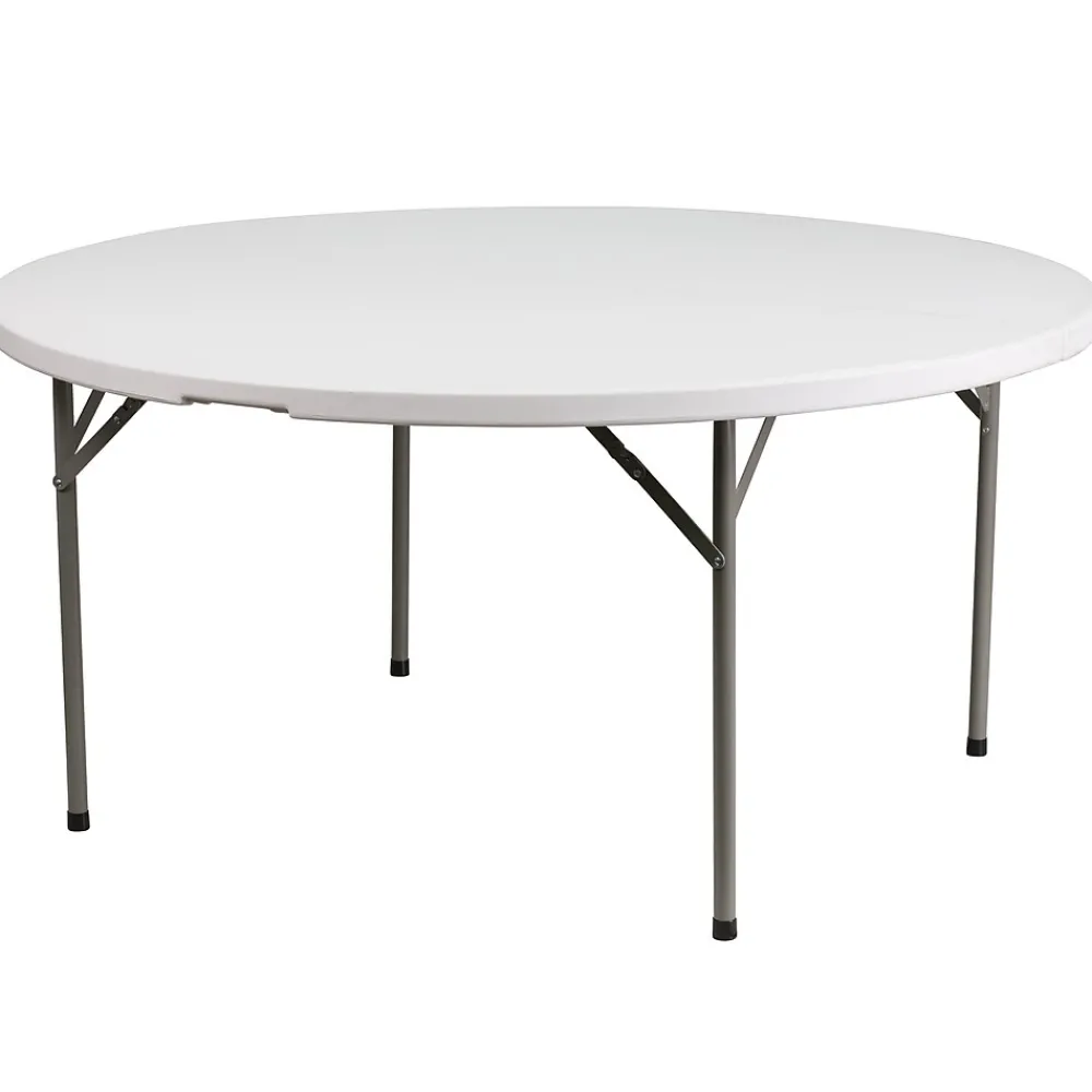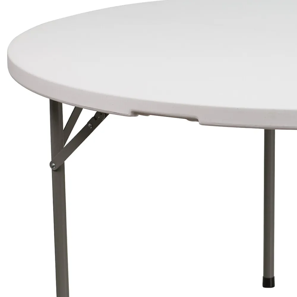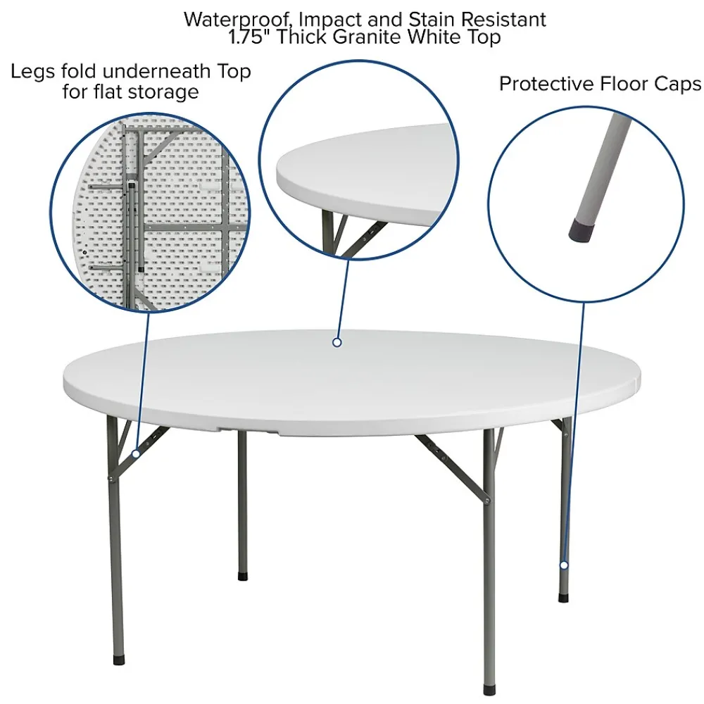 Ensure you have enough surface space for any function and take the stress out of hosting your next gathering. The round dining folding table is a great option for special event planners, catering companies and banquet facilities. This durable, easy to clean table is commercial rated for use in banquet halls, convention centers and at trade shows. Use during game night, dress it up for holiday parties, and coordinate crafts night. The thick, granite white tabletop is 60″ in diameter, 1.75″ thick, and will comfortably seat up to 8 adults. Its waterproof, impact and stain resistant top have a 551 pound static load capacity. Attractive gray powder coated legs lock securely in place while in use and non-marring floor caps protect your floor by sliding smoothly when you need to move the table. Designed for both indoor and outdoor use, store table indoors and protect the frame from extreme moisture. The 60″ Round Granite White Plastic Folding Table is a convenient option for your next home, school or business event.