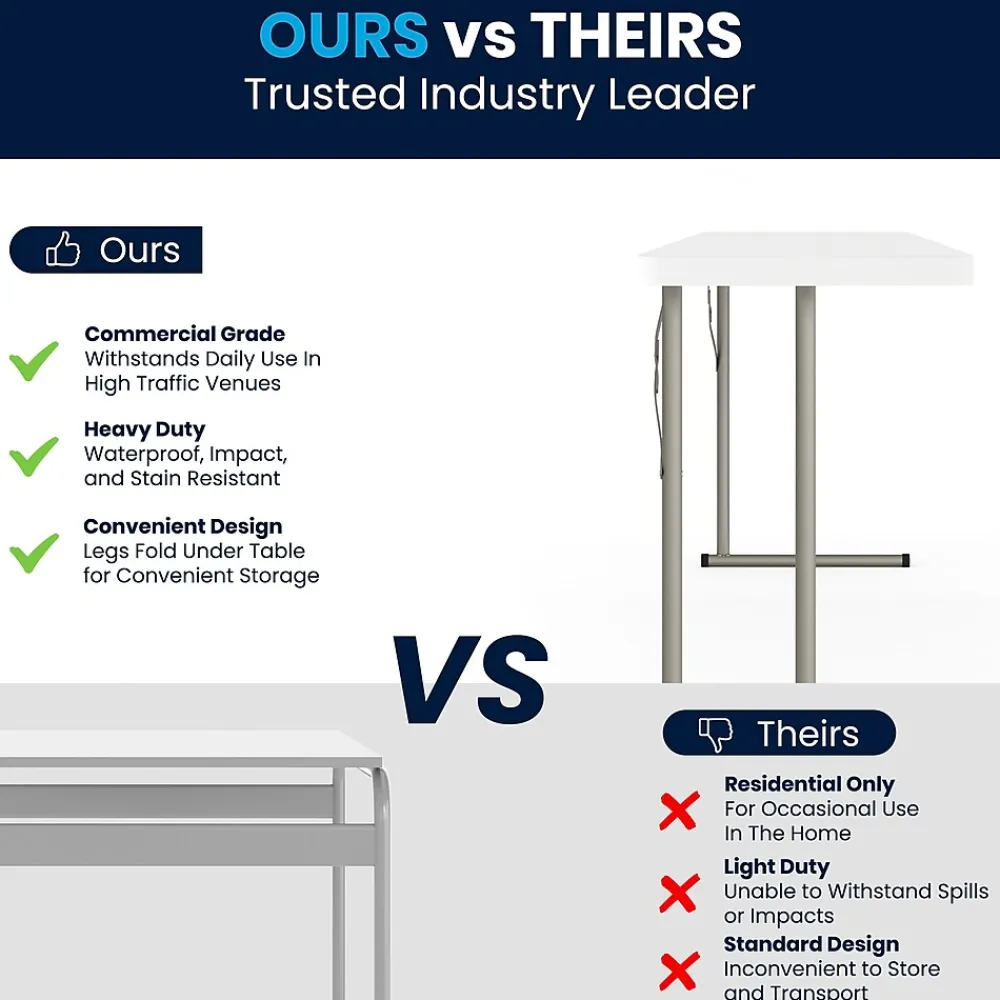 If you are in the market for a truly multi-functional table look no further. Use as extra dining surface for the holidays, a place to hold your sewing machine, indoor plants, pamphlets in your reception area or for your next seminar. This rectangular folding table is 8 feet long and can seat up to four adults making it beneficial in a multitude of settings that include the classroom, sewing room, solarium, banquet halls and in training rooms. The space saving design can allow multiple tables in a small to large setting making it the perfect style table for virtually any use. The durable blow molded top is low maintenance and cleans easily. This table has extendable feet that provide a stable work surface and the legs fold under the table to make storage more convenient and for better portability.