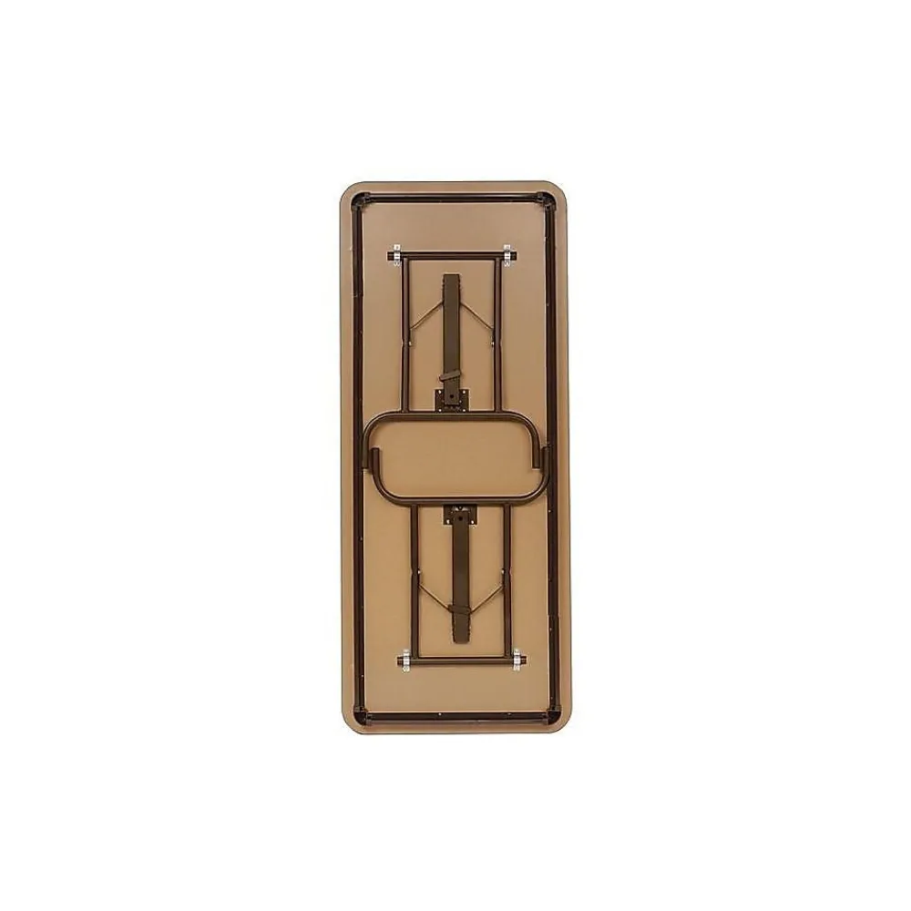 - Mahogany/brown folding table is made of melamine and features heavy gauge steel base