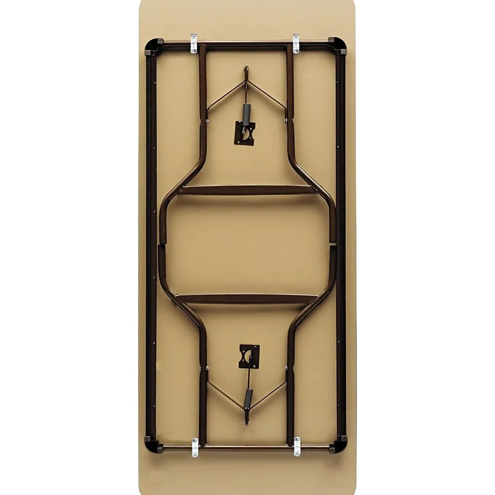 - Folding tables feature a wear-resistant, 3/4″ top surface; laminated melamine over particle board with a melamine-sealed underside and bull-nose vinyl T-mold edging