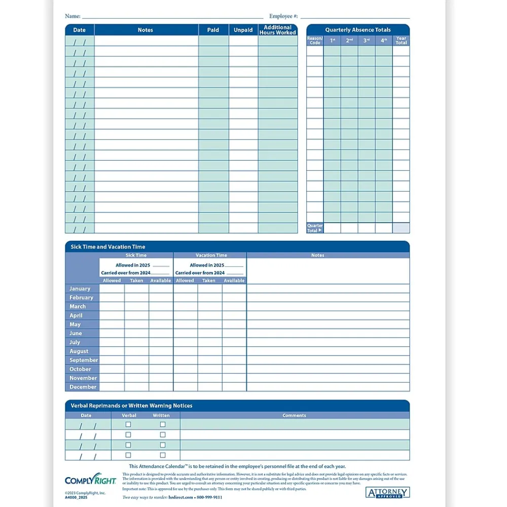 - Back side of card includes sections to take notes, track vacation and sick time, and document any attendance-related disciplinary action